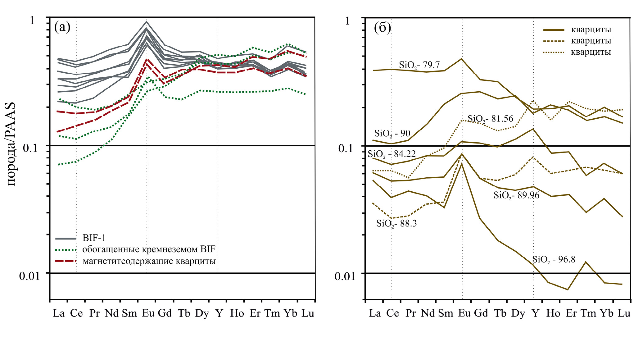- Мезоархейские BIF-1 КЗП, также, как и большинство архейских BIF, характеризуются наличием яркой положительной Eu-аномалии (Eu/Eu*ср = 1.6), отсутствием Ce-аномалии (Ce/Ce*ср=0.94), обеднением ЛРЗЭ (La/Yb ср = 0.8), вместе с тем, они выделяются среди других BIF относительно высоким содержанием Al2O3, TiO2, MgO, K2O, Cr, Ni, Zr, Th, Ba, Zn, Cu.