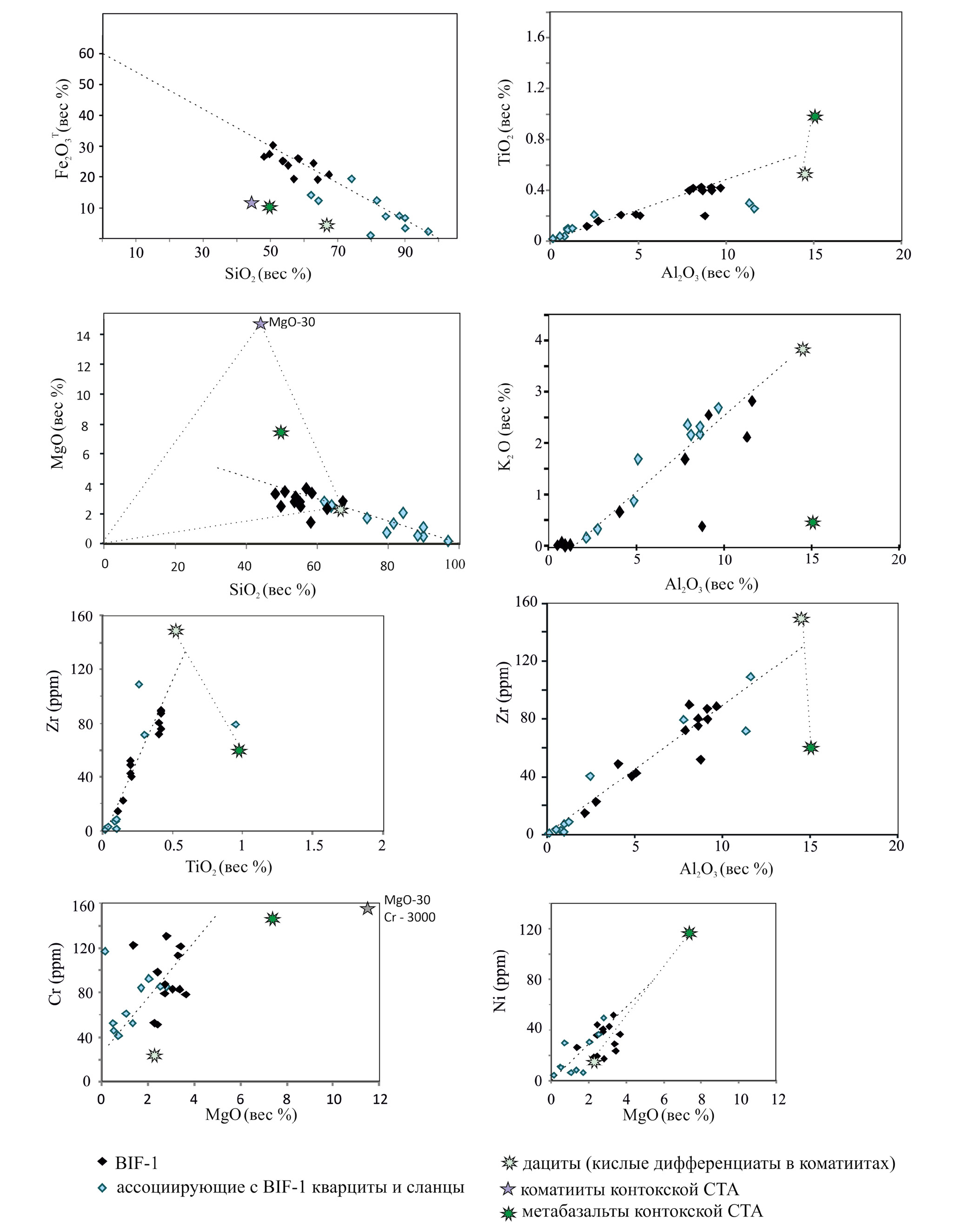 BIF-содержащие комплексы осадков установлены, как было отмечено выше, среди базальт-коматиитовой с дацитами толщи контокской СТА (рис. 1б). В базальтах и коматиитах толщи местами хорошо сохраняются шаровые текстуры, а в коматиитах, кроме того, описаны структуры спинифекс (Горьковец и др., 1981). Химический состав типичных пород приводится в табл. 1 (№ 26–28). Следует отметить, что среди коматиитов рувинваарской свиты установлены кислые (от андезитового до дацит-риолитового состава) дифференциаты ликвационной природы (Володичев и др., 2009; Вревский, 2022). Они слагают в ряде тел коматиитов ядра подушек, причем в некоторых из них дацит-риолиты составляют до 80–90 % их объема (Вревский, 2022). Таким образом, линзы осадков контокской СТА формировались среди шаровых базальтов, коматиитов и их кислых дифференциатов.