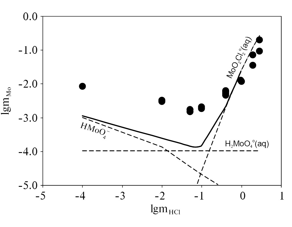 В ряде экспериментальных работ по растворимости оксида молибдена и твердой молибденовой кислоты при температуре ниже 100 °C показано, что в концентрированных растворах соляной кислоты растворимость сильно возрастает. Увеличение концентрации HCl в растворе, содержащем комплексы Mo(VI), приводит к образованию хлорокомплексов, преобладающими моноядерными формами среди которых являются [MoO2(OH)(H2O)3]+ (от 1 до 3.5 М HCl) и MoO2Cl2(р-р) (от 3.5 до 10 М HCl) (Dement’ev et al., 2007). В растворах 0.1 M HCl при 300–450 °C в присутствии ионов калия и натрия растворимость молибдена контролируется образованием комплексов щелочных металлов KHМоО4o и NaHМоО4o (Кудрин, 1989). В работе (Dadze, 2018) предполагается, что наиболее вероятной формой хлорида Mo(VI) в водных растворах смеси HCl–HClO4–NaCl (до 1 М хлорид-иона) при 573.2 К и давлениях, близких к давлению насыщенного водяного пара, является MoO2(OH)2Cl–, что согласуется с литературными исследованиями EXAFS и XANES. В рассолах H2O–HCl–NaCl при температуре до 385 °C при давлении 600 бар по данным EXAFS и XANES установлено, что тетраэдрические комплексы, содержащие анион молибдата (MoO42–) преобладают в основных и почти нейтральных растворах с концентрацией хлоридов до 5.5 М, при этом нет комплексообразования между MoO42– и хлоридами. В сильно кислых растворах преобладают искаженные октаэдрические оксохлорокомплексы MoOmCln6–2m·n; количество хлоридных лигандов увеличивается с повышением температуры, достигая максимум 5 при 340 °C в 6.21 М HCl (Borg et al., 2012).