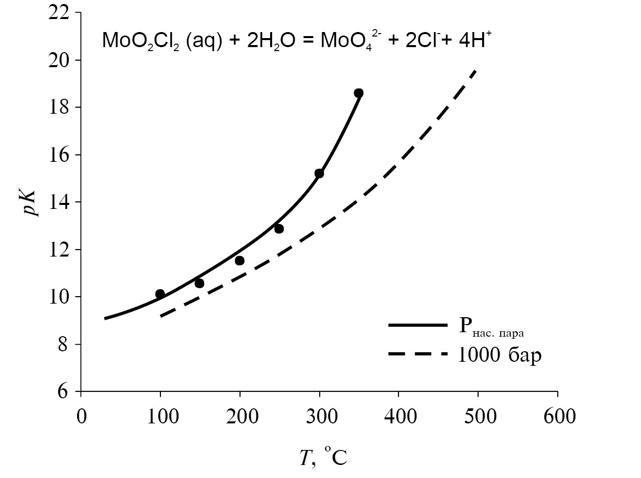 Исследование растворимости оксида молибдена в малоплотной водной фазе показало, что в присутствии HCl образуется гидратированный газовый комплекс MoO2Cl2·nH2O(г) (Rempel et al., 2006). Однако изучение устойчивости растворенного оксихлорида молибдена (VI) в плотных водных растворах при повышенных температурах не проводилось.