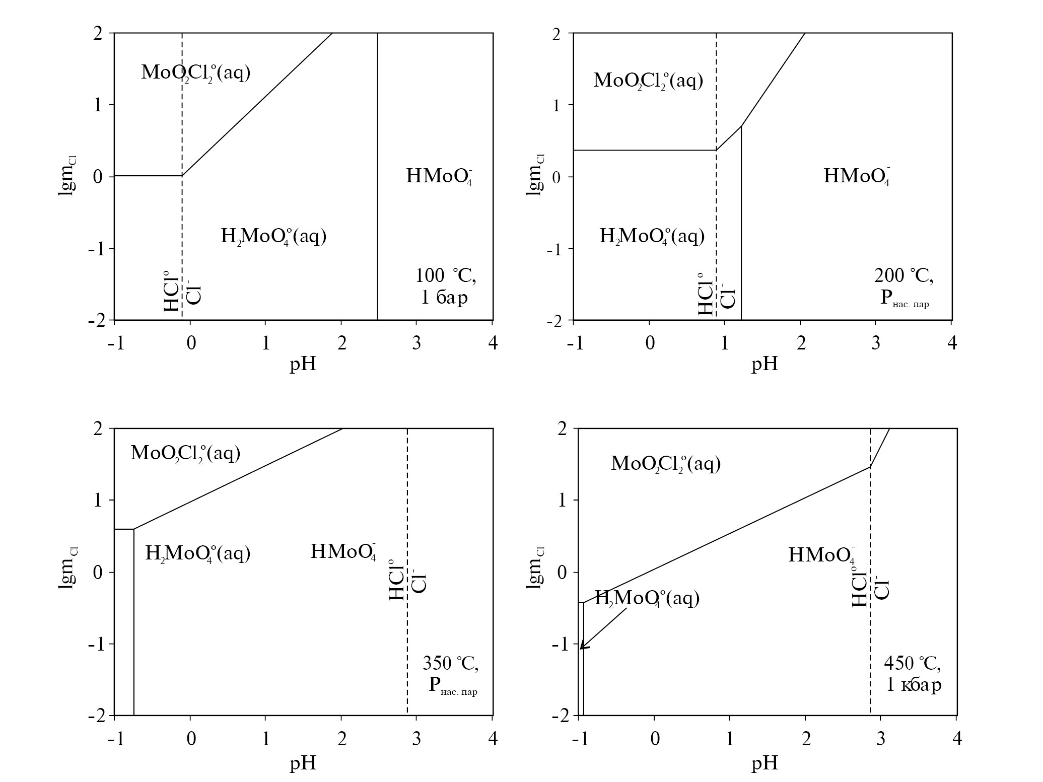 По результатам расчетов были построены диаграммы полей преобладания форм молибдена в растворе в системе MoO3–H2O–HCl при заданных давлениях и температуре (рис. 5). Границы между полями преобладания форм молибдена были построены при условии равенства концентрации форм. Диаграммы показывают, что с увеличением температуры и давления поле преобладания комплекса MoO2Cl2(р-р) расширяется. С повышением температуры HCl становится слабее, а кислота H2MoOo4(р-р) становится сильнее, что непосредственно влияет на поле преобладания оксихлорида молибдена. И если при низком давлении и температуре оксихлорид молибдена (VI) может образовываться только при pH ниже 2, то при температуре 450 °C и давлении 1 кбар он существует уже при pH, равном 3. Такие условия соответствуют порфировым и грейзеновым системам. Поэтому мы предполагаем, что такое соединение, как MoO2Cl2(р-р) может играть важную роль в переносе молибдена в гидротермальных растворах при формировании порфировых и грейзеновых месторождений.