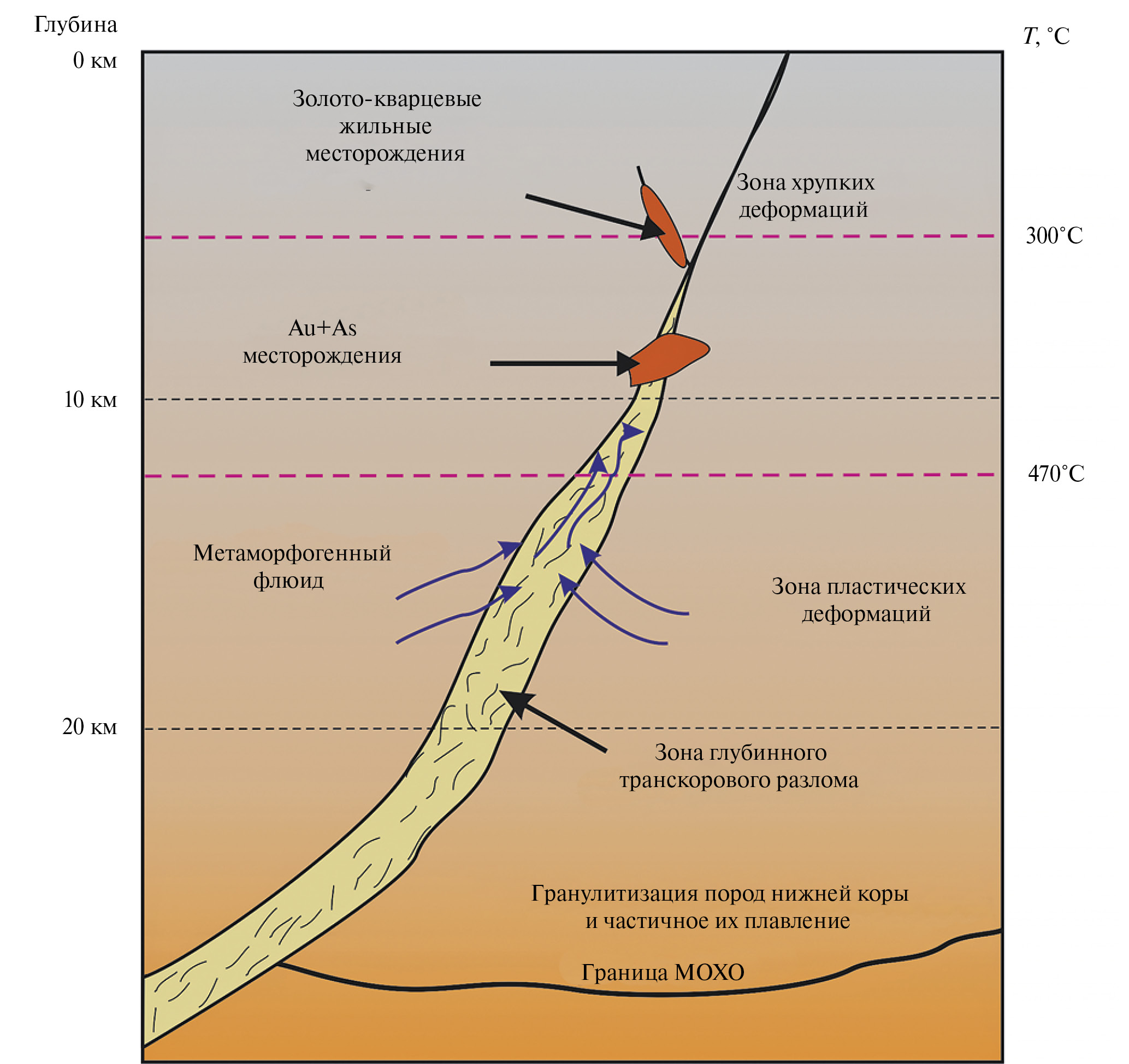 В отношении генезиса золоторудных месторождений орогенного типа в настоящее время разрабатывается две основные концепции: корового метаморфизма (crustal metamorphic model) и магматогенно-гидротермальная рудообразования (magmatic-hydrothermal model). Наиболее популярной из них является метаморфогенная концепция, которая наиболее полно изложена в работах (Tomkins, 2013a; Goldfarb, Groves, 2015; Groves et al., 2020). В соответствие с этой концепцией формирование мезотермальных месторождений золота орогенного типа связано с внутрикоровыми метаморфическими процессами, протекавшими на глубинах менее 20–25 км. В качестве главного источника как рудообразующих растворов, так и металлов, включая золото, рассматриваются супракристаллические породы (как правило, осадочного происхождения), дегидратация которых происходила при P-T условиях, отвечающих зеленосланцевой или амфиболитовой фациям метаморфизма (рис. 2). В качестве флюидоподводящих и рудоконтролирующих структур предполагаются транскоровые тектонические зоны и оперяющие их разломы.
