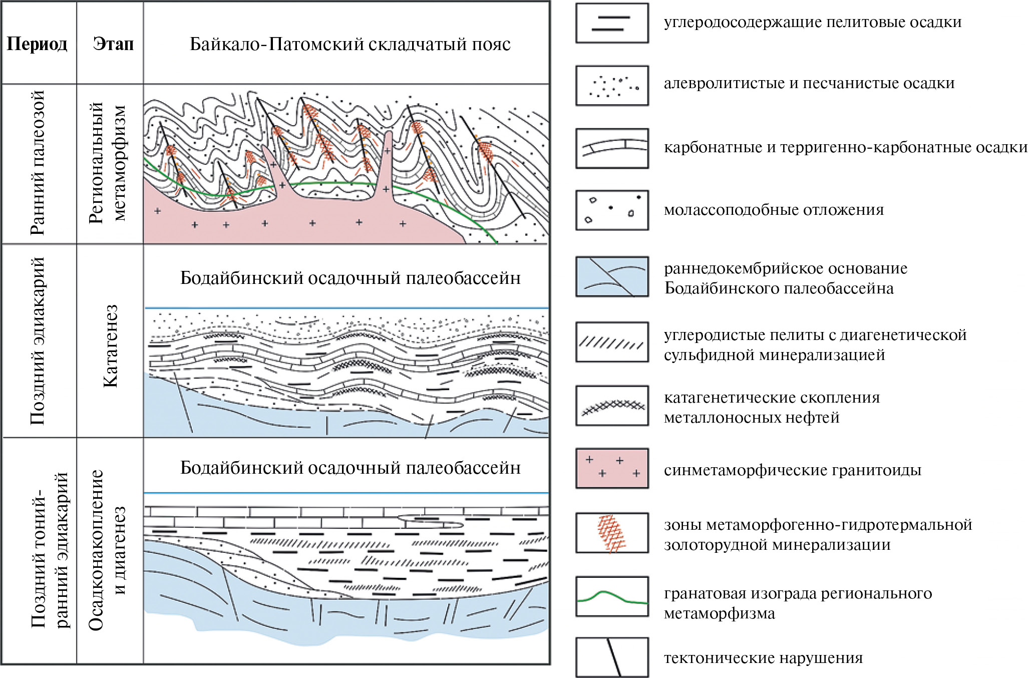 Осадочные толщи Бодайбинской зоны претерпели полифациальный региональный метаморфизм. При этом наблюдается закономерное расположение фациальных зон внутри района. Породы, метаморфизованные в условиях эпидот-амфиболитовой и амфиболитовой фаций, расположены по краям Бодайбинского синклинория и пространственно приурочены к периферийным частям раннепротерозойских выступов Чуйско-Тонодско-Нечерской зоны и к контактам палеозойских гранитоидов. На удалении от них в центральной части Бодайбинской зоны преимущественно развиты породы, преобразование которых происходило в условиях низкотемпературной зеленосланцевой фации метаморфизма (Петров, Макрыгина, 1975; Кориковский, Федоровский, 1980; Иванов и др., 1995 и цитируемые в них работы.). Существующие представления о времени проявления метаморфических процессов в Бодайбинской зоне противоречивы. Однако большинство исследователей предполагают раннепалеозойский возраст метаморфизма (Виноградов и др., 1996; Meffre et al., 2008; Зорин и др., 2008; 2009; Юдовская и др., 2011). Имеющиеся геохронологические данные определяют весьма широкий возможный временной интервал развития метаморфизма от 520 млн лет (Виноградов и др., 1996; Meffre et al., 2008) до 420 млн лет (Зорин и др., 2008) с наличием нескольких пиков, приходящихся на позднекембрийское-раннеордовикское время (Бухаров и др., 1992; Meffre et al., 2008; Юдовская и др., 2011; Yudovskaya et al., 2016; Palenova et al., 2019).