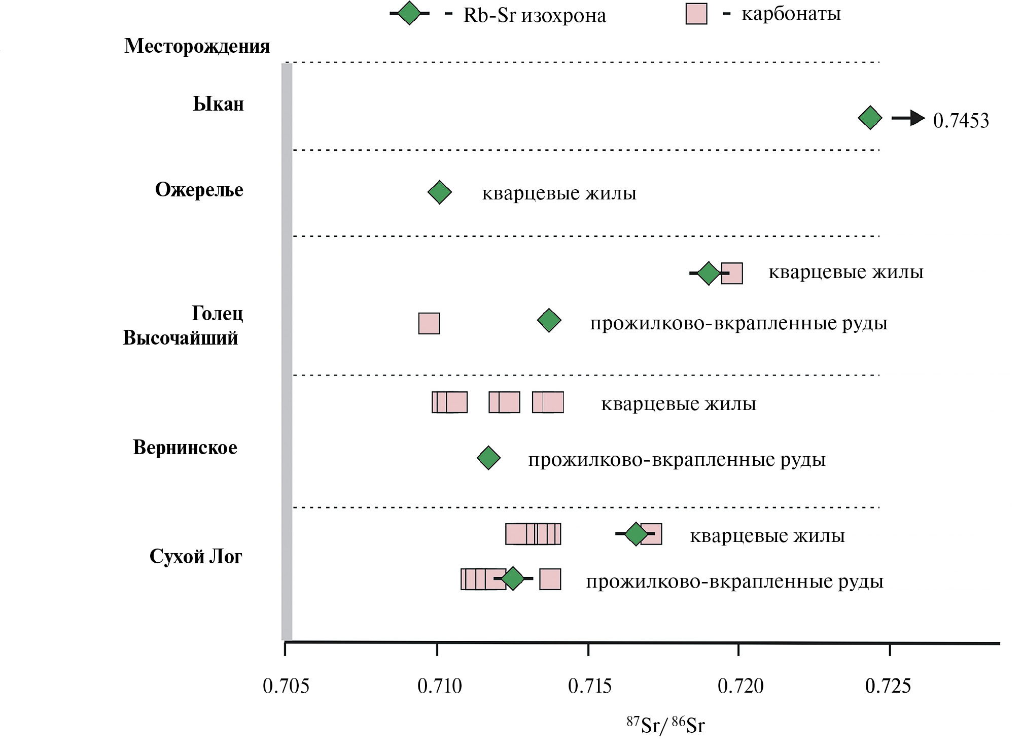 Приведенный выше обзор по орогенным месторождениям России нельзя рассматривать как исчерпывающий. В российской научной среде понятие «орогенные» не получило столь широкого распространения, как зарубежом. Вследствие этого зачастую затруднительно определить, к какому типу принадлежит то или иное месторождение только на основании геологического описания, приводимого в научной литературе. Сложность добавляет и то обстоятельство, что для многих месторождений существуют противоположные точки зрения как на их происхождение, так и на их принадлежность к тому или иному типу. В качестве примера можно привести крупное месторождение Дарасун, расположенное в Восточном Забайкалье. Согласно обзорной работе (Goldfarb et al., 2014), оно является представителем месторождений орогенного типа. Напротив, в работах (Прокофьев и др., 2000; Prokof’ev et al., 2010; Чугаев и др., 2013; Чернышев и др., 2014) обосновывается генетическая связь золоторудной минерализации с юрским гранитоидным магматизмом и принадлежность месторождения к типу объектов магматогенного происхождения (intrusion related).