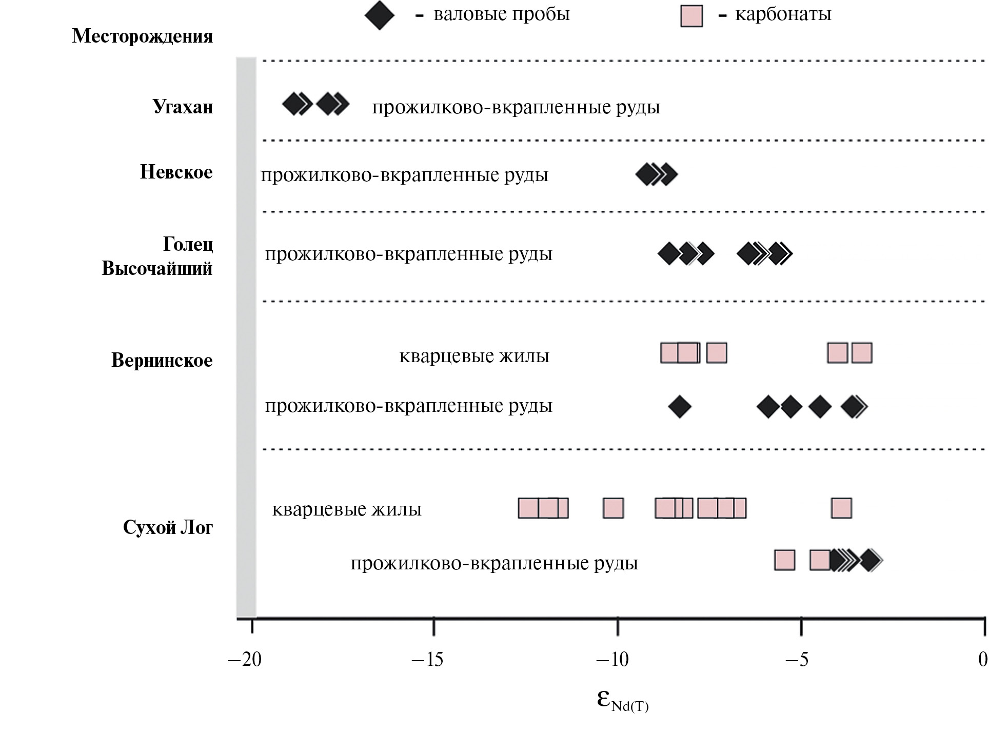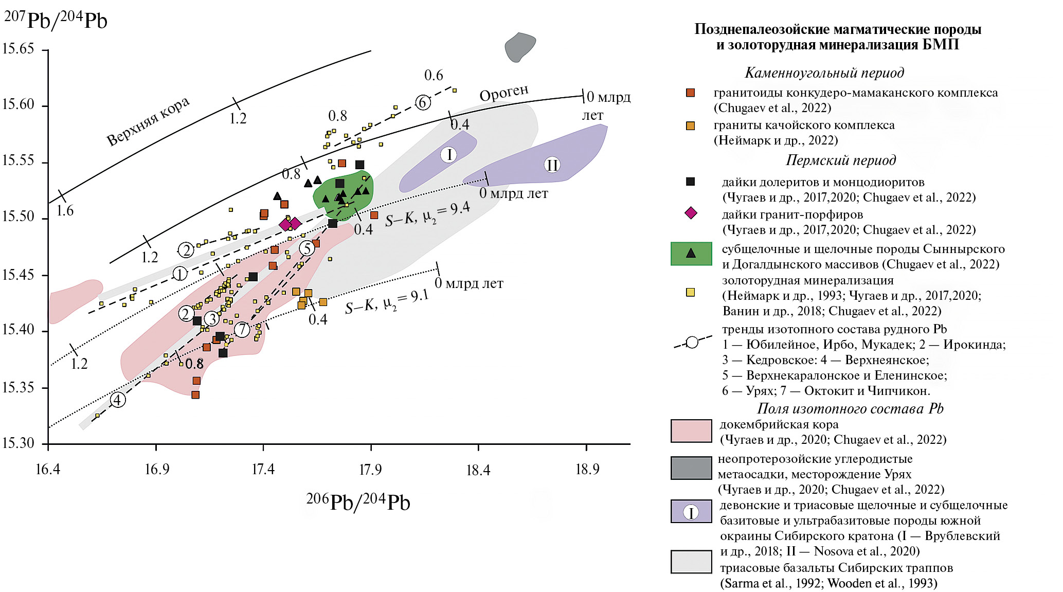 Isotopic-geochemical data (87Sr/86Sr, 143Nd/144Nd, Pb-Pb, and δ34S) indicate that the mesothermal ore-forming systems of the Northern Transbaikalia were heterogeneous in their isotopic characteristics, which distinguishes them from ore-magmatic (intrusion related type) systems. Comparison of Sr, Nd and Pb isotopic composition of ores and rocks of the region, including magmatic rocks of the same age as gold mineralization, proves the leading role of the Precambrian continental crust in the supply of mineral-forming components to the hydrothermal systems of gold deposits. The contribution of the magmatic source of matter in the genesis of orogenic gold mineralization was limited and is established only for the Early Permian ore-forming systems of the BMP, for which the input of metals from alkaline melts of basite composition is assumed.