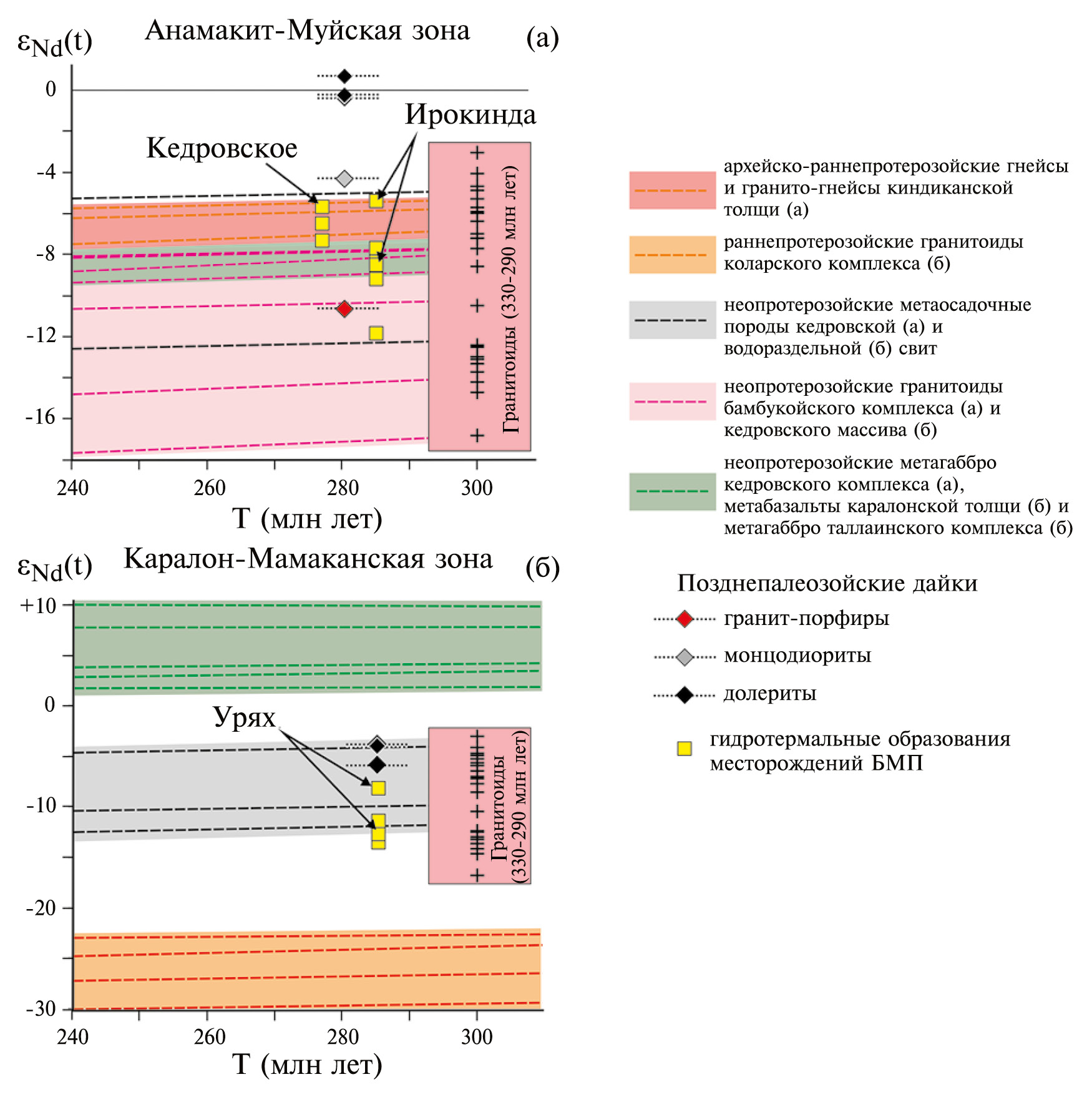 К наиболее древним образованиям отнесены метаморфические породы (гнейсами, гранитогнейсами, кристаллическими сланцами, кальцифиры) киндиканской толщи и джалтукской серии, выходы которых присутствуют в восточной части (Муйская подзона) Анамакит-Муйской зоны (рис. 9). Они формируют относительно крупные тектонические структуры, известные как Северо-Муйскую и Южно-Муйскую глыбы. Традиционно они рассматриваются исследователями региона как выходы раннедокембрийского фундамента древнего кратона. Однако в работе (Зорин и др., 2009) высказано также предположение, что это основание (цоколь) позднепротерозойской островной дуги. Следует отметить, что возраст этих пород на основании геологических данных принимается как позднеархейско(?)-раннепротерозойский. Имеющиеся единичные Nd-модельные оценки указывают на раннепротерозойский возраст субстрата, по которому сформированы эти метаморфические породы (Рыцк и др., 2011; Чугаев и др., 2020). С этими оценками согласуются наши (неопубликованные) U-Pb исследования акцессорных цирконов в палеозойских риолитовых дайках, прорывающих гнейсы киндиканской толщи в пределах Южно-Муйской глыбы. Они дали максимальные значения возраста в 1.9–1.8 млрд лет, который можно рассматривать как нижнюю возрастную границу для пород киндиканской толщи. Кроме того, непосредственное U-Pb геохронологическое исследование цирконов из гнейсов киндиканской толщи показали, что в их состав могли быть ошибочно включены породы тонийского возраста.