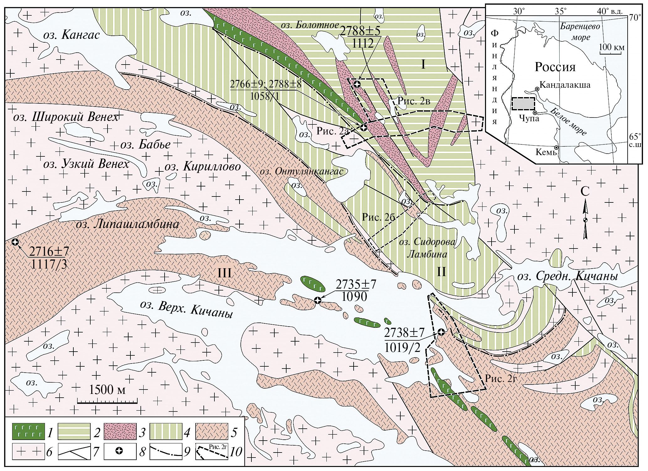 Рис. 1. Схематическая геологическая карта Кичанской структуры: 1 — нерасчлененный комплекс габбро-норит-лерцолитов; 2 — амфиболиты с Grt и без него (метабазальты и метаандезибазальты) нижней толщи; 3 — Bt (редко с Grt) гнейсы (кислые метавулканиты, в подчиненном количестве метаграувакки) нижней толщи; 4 –амфиболиты с Grt и без него (метабазальты и метаандезибазальты) средней толщи; 5 — Bt, Grt-Bt, Amp-Grt-Bt гнейсы (средние и кислые метавулканиты), в подчиненном количестве амфиболиты (основные метавулканиты) верхней толщи; 6 — архейские гранитоиды нерасчлененные; 7 — разломы; 8 — места отбора геохронологических проб: в числителе — значение возраста в млн лет, в знаменателе — номер пробы; 9 — условные границы между выделенными толщами, римскими цифрами обозначены площади распространения нижней (I), средней (II) и верхней (III) толщ; 10 — контуры геологических схем строения фрагментов разреза.