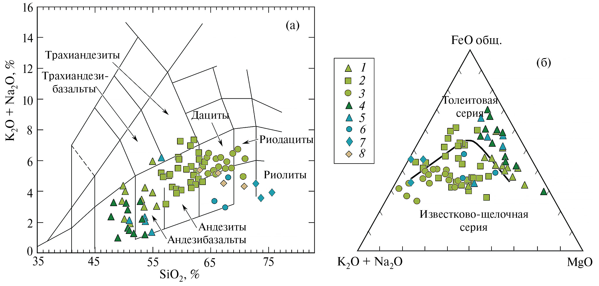 Рис. 3. Положение химических составов пород нижней, средней и верхней толщ на классификационных диаграммах. (а) TAS (Le Maitre et al., 1989) и (б) AFM (Irvine, Baragar, 1971). Верхняя толща: 1 — метабазальты и метаандезибазальты. 2 — метаандезиты. 3 — метадациты; средняя толща: 4 — метабазальты и метаандезибазальты; нижняя толща: 5 — метабазальты и метаандезибазальты, 6 — метадациты, 7 — метариолиты, 8 — метаграувакки.