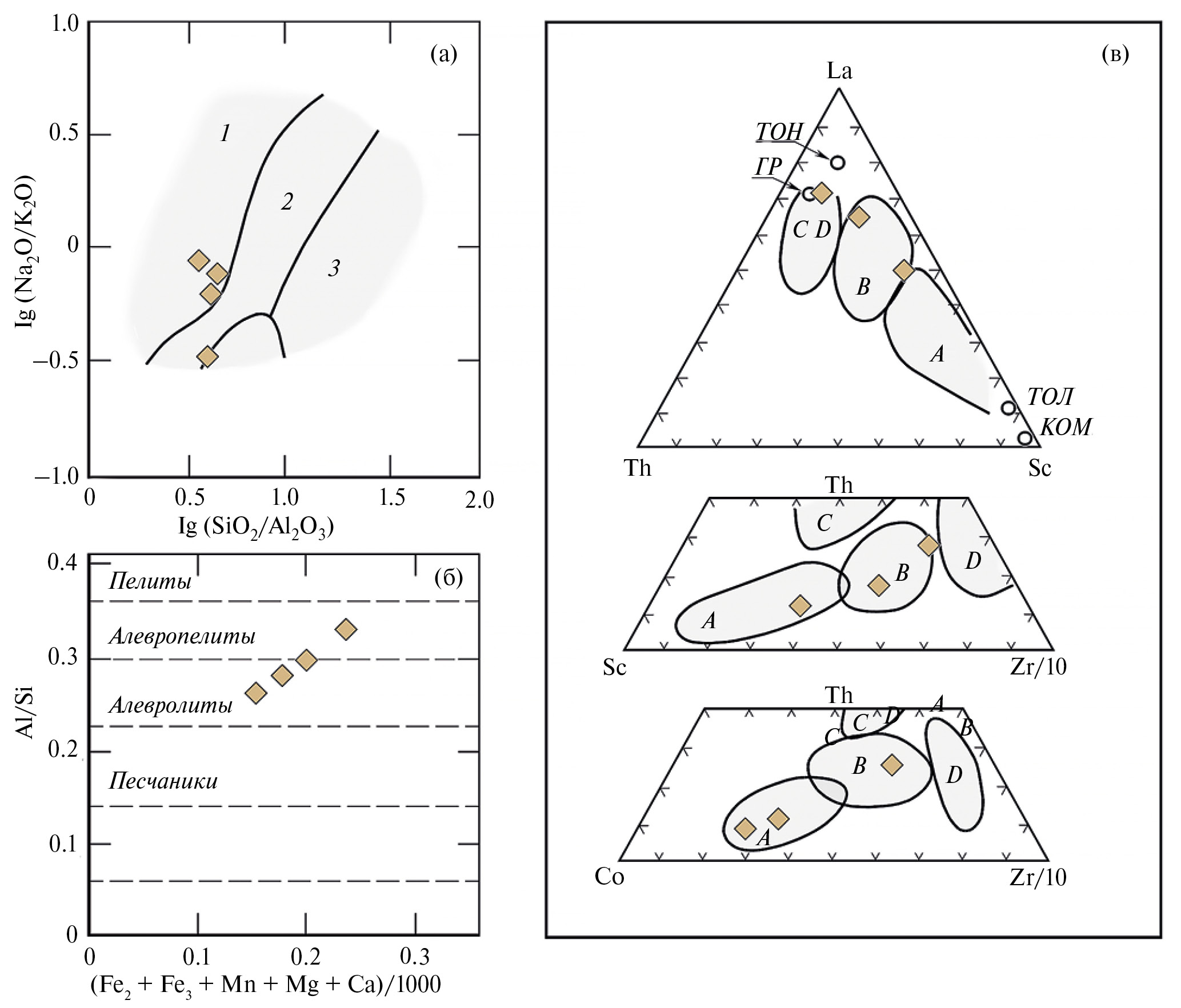 На классификационной диаграмме lg (SiO2/Al2O3) — lg (Na2O/K2O) (Rollinson, 1993) изученные метаосадки попадают в поле граувакк (рис. 8а), сопоставимы по составу с алевролитами и алевропелитами (рис. 8б) и распределения РЗЭ в них в первом приближении близки спектрам распределения лантаноидов в постархейском среднем глинистом сланце Австралии (PAAS) (Nance, Taylor, 1976) (рис. 6 Iв, 6 IIв). Источниками терригенного материала в изученных метаграувакках, скорее всего, служили дациты толщи, с которыми они находятся в тесном переслаивании в едином стратиграфическом разрезе. Такой вывод напрашивается при сравнении химических составов этих двух групп пород (рис. 4, 5, 6, табл. 1). Граувакки такого происхождения относятся к вулканомиктовым.