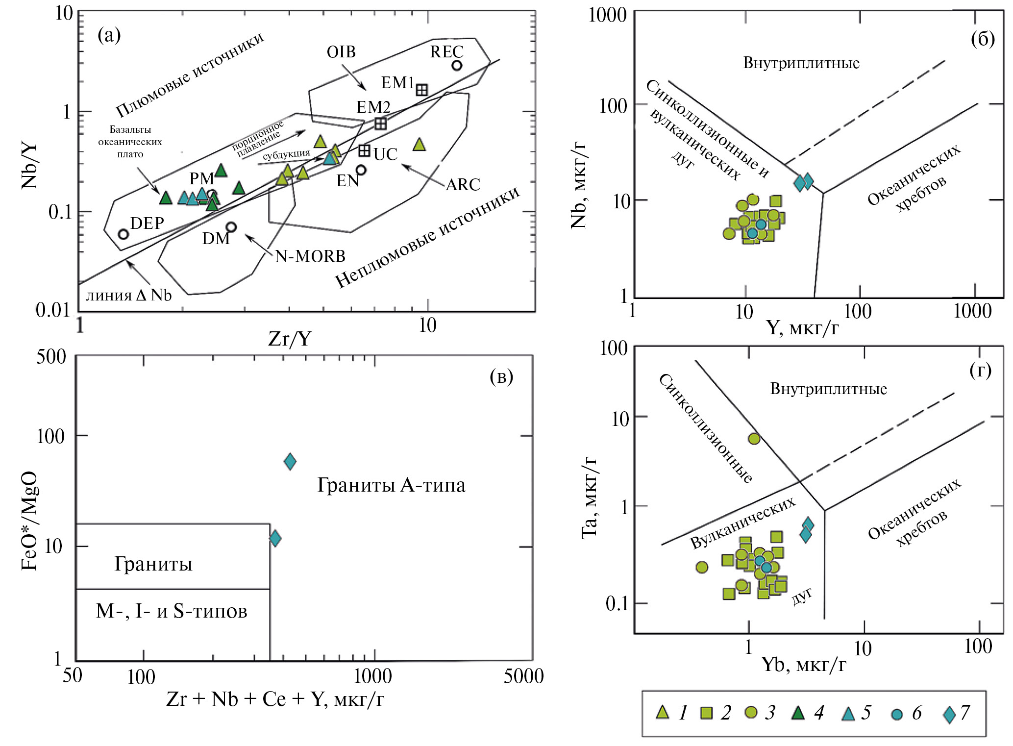Рис. 12. Дискриминационные диаграммы (а) Nb/Y–Zr/Y (Condie, 2005), (б) Nb–Y, (в) Ta-Yb (Pearce et al., 1984), (г) FeO/MgO — (Zr+Nb+Ce+Y) (Whalen et al., 1987) для метавулканитов Кичанской зеленокаменной структуры. OIB — базальты океанических островов, N-MORB — базальты срединно-океанических хребтов, ARC — базальты островных дуг, UC — верхняя кора, EN — литосферная мантия, PM — примитивная мантия, DM — деплетированная мантия, DEP — глубинная деплетированная мантия, EM1 и EM2 — обогащенная мантия, REC — рециклированный компонент. Верхняя толща: 1 — метабазальты и метаандезибазальты, 2 — метаандезиты, 3 — метадациты; средняя толща: 4 — метабазальты и метаандезибазальты; нижняя толща: 5 — метабазальты и метаандезибазальты, 6 — метадациты, 7 — метариолиты.