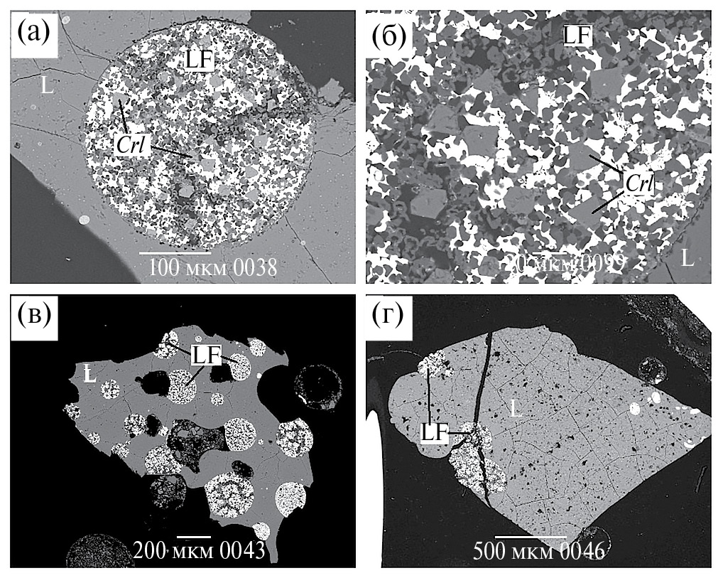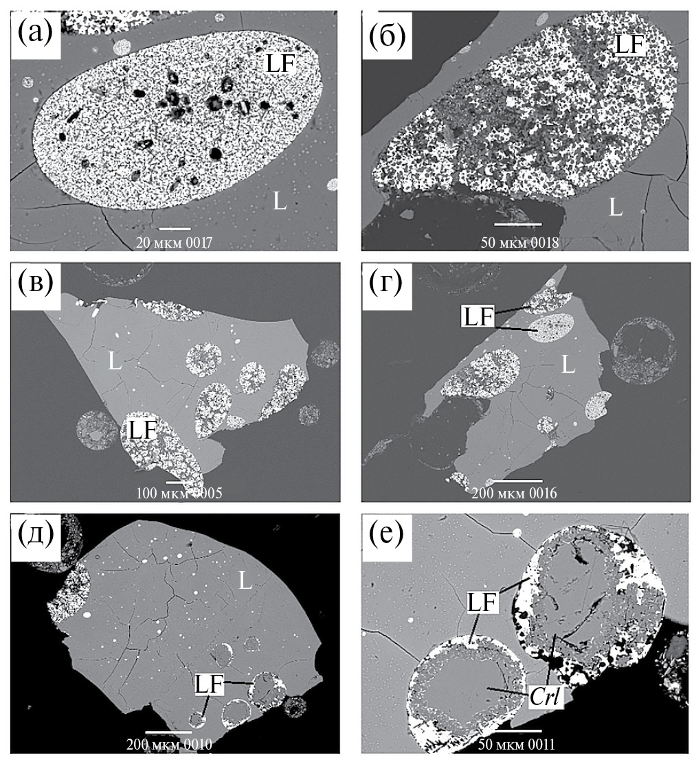 Рис. 1. Фазы в продуктах опыта 820 (Т = 700 °C, Р = 1 кбар, 9.2 мас. % H2O). а — глобуль 1 типа (LF); б — глобуль 2 типа (LF); в, г — глобули солевого состава (LF) 1 и 2 типов в матрице алюмосиликатного стекла (L); д — фрагмент образца с глобулями (LF) 3 типа; е — солевые глобули 3 типа диаметром до 150 мкм, в центре которых образовались кристаллы криолита (Crl), окруженные закаленным солевым расплавом (LF). Фториды REE находятся в краевой части глобулей. Изображение в BSE.