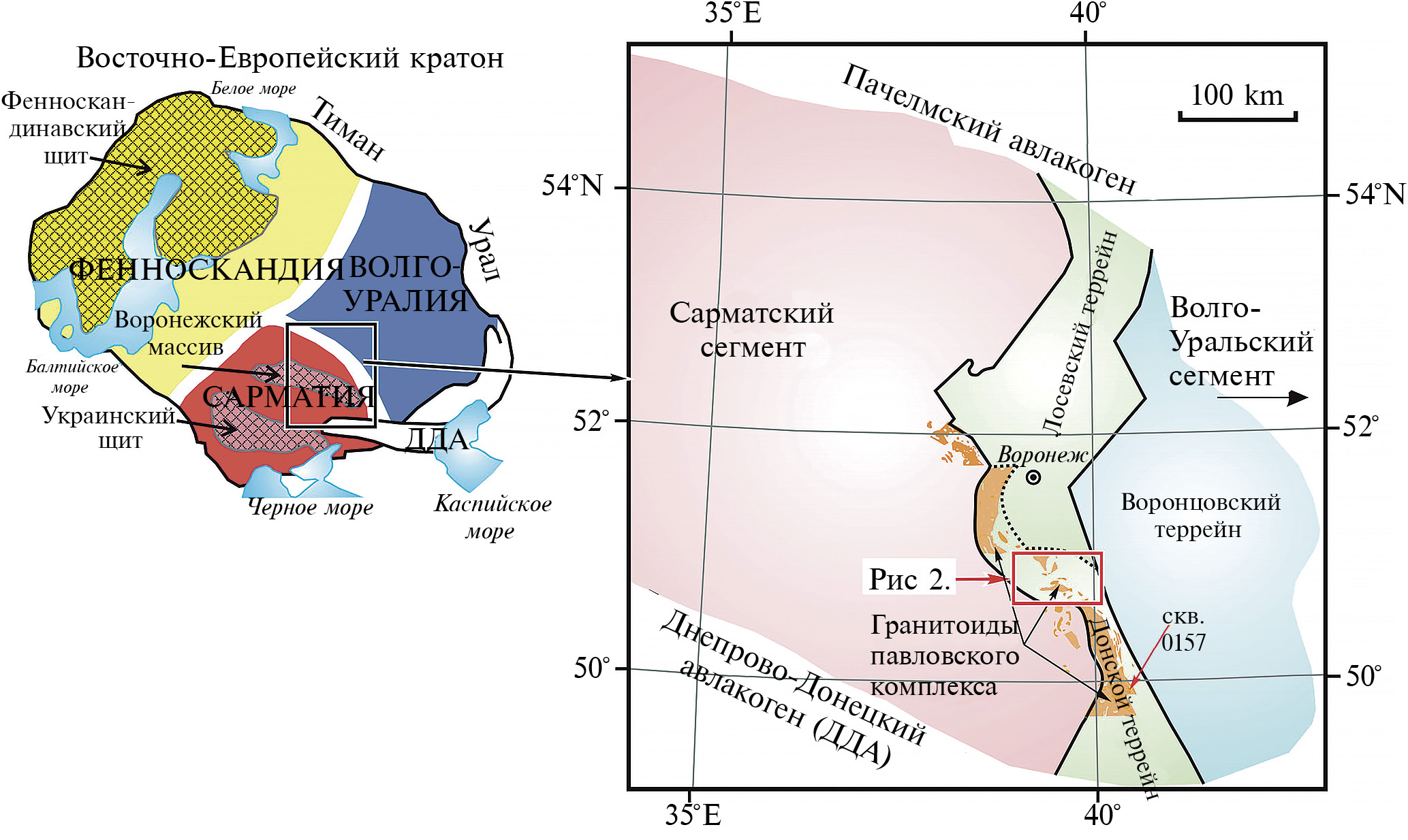 Супракрустальные породы донской серии одноименного террейна ВДО, скрытые под мощным (0–300 м) чехлом осадочных отложений, распространены на восточной окраине Сарматского сегмента Восточно-Европейского кратона. Это западная часть палеопротерозойского ВДО аккреционного типа (рис. 1). ВДО разделяет два крупных докембрийских мегаблока Восточно-Европейского кратона — Сарматию и Волго-Уралию. ВДО возник в результате орогенеза 2.2–2.05 млрд лет назад (Щипанский и др., 2007; Бибикова и др., 2009; Bogdanova et al., 2005; Terentiev et al., 2017; Savko et al., 2018). Западная часть этой провинции состоит из нескольких террейнов (Донской, Лосевский и Воронцовский, рис. 1), разделенных крупными региональными разломами и зонами дробления. Первые два террейна, как правило, объединяются и известны в литературе под названиями Лосевская шовная зона (Петров, Чернышев, 1998; Терентьев, 2005), Ливенско-Богучарская структура (Чернышов и др., 1997) или Липецко-Лосевский вулкано-плутонический пояс (Mints et al., 2015). Донской террейн/пояс, самый западный в ВДО, протягивается вдоль восточной границы Сарматского сегмента Восточно-Европейского кратона.