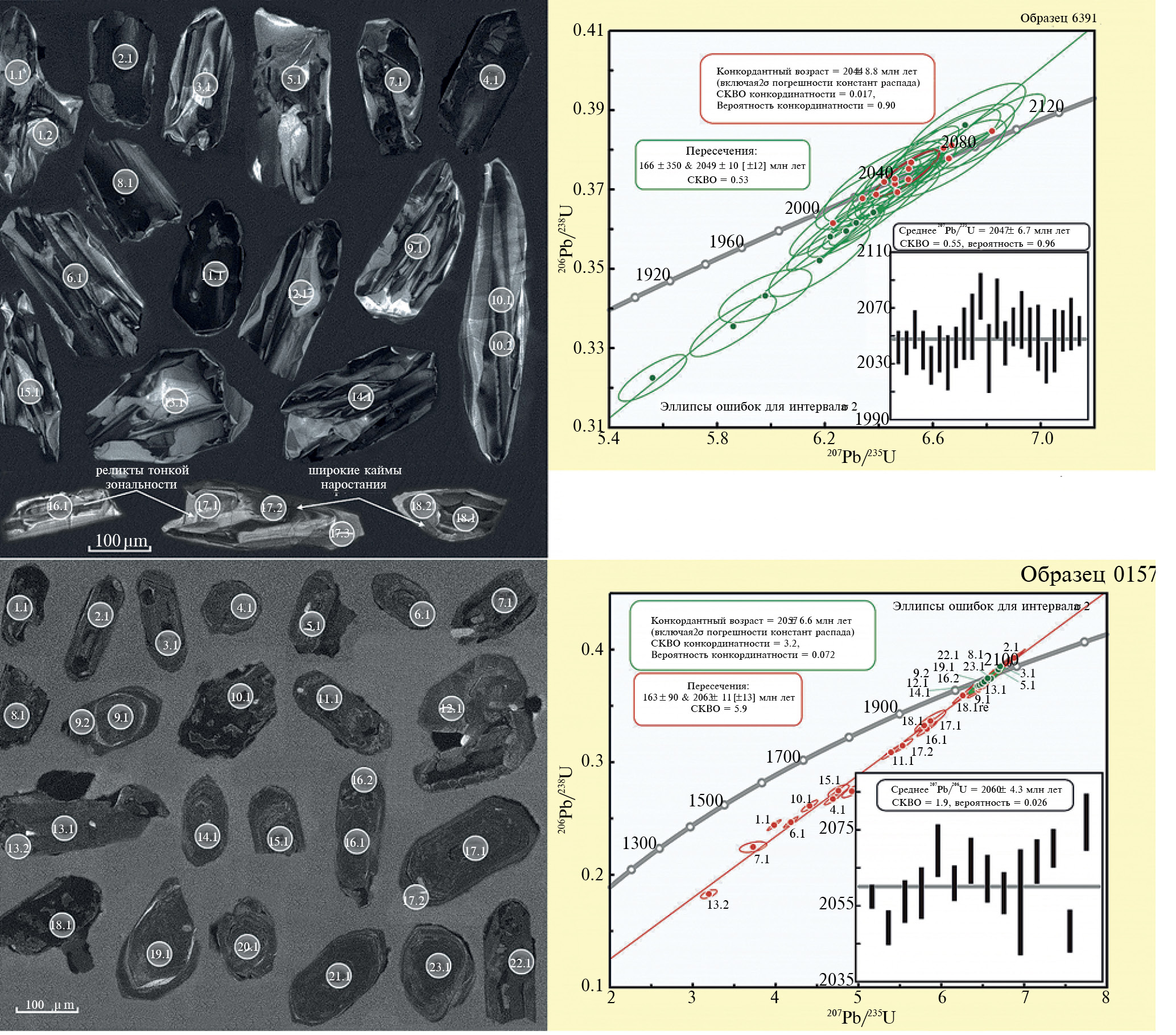Полученный в пробе 0157/231.1–242.7 возраст 2060 ± 4 млн лет по осциляционно-зональным кристаллам совпадает с возрастом гранитоидного батолита, вмещающего ксенолит. Это подтверждается как близким возрастом кристаллизации павловских гранитоидов, так и многочисленными признаками перекристаллизации циркона. Тем не менее, единственное ядро с архейским возрастом, наряду с 2831 ± 21 и 2979 ± 7 млн лет возрастами ядер из лискинских гранитоидов и гнейсов Донского террейна (Терентьев, 2016; Лобач-Жученко и др., 2017), свидетельствуют о том, что, по крайней мере, подстилающие или окружающие породы донской серии имеют архейский возраст. Это подтверждает и изотопный состав гранитоидов в Донском террейне, которые характеризуются как архейскими до 2.8 млрд лет, так и протерозойскими Nd-модельными возрастами (Terentiev et al., 2020; Петракова и др., 2024).