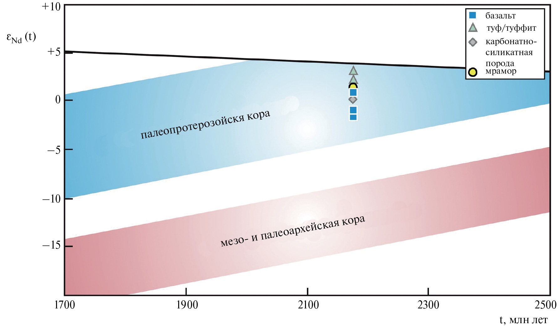 Большинство изученных пород донской серии имеют ювенильный изотопный состав Nd: положительные или слабо отрицательные значения εNd(t) и близкие модельные возрасты 2181–2448 млн лет. Два образца метавулканитов характеризуются отрицательными значениями εNd(t) и на 100 млн лет более древними модельными возрастами [tNd(DM)], что, скорее всего, связано с контаминацией материалом континентальной коры. Для цирконов из метавулканитов характерны знакопеременные значения εHf(t), в среднем близкие к нулю и схожие модельные возрасты, около 2.4 млрд лет. Эти изотопные характеристики предполагают обогащенный мантийный или смешанный корово-мантийный источник исходных расплавов вулканитов и ювенильный источник для осадков. На рис. 8, показано, что изотопный состав неодима в вулканитах донской серии существенно отличался от изотопного состава деплетированной мантии в момент формирования пород. Их источниками могли являться субдуцирующая океаническая плита, расположенные выше мантийный клин и континентальная кора, что характерно для обстановки активной континентальной окраины. Океаническая плита старше на 100–200 млн лет, чем породы донской серии, если опираться на неодимовые и гафниевые модельные возрасты (табл. 3 и 4).