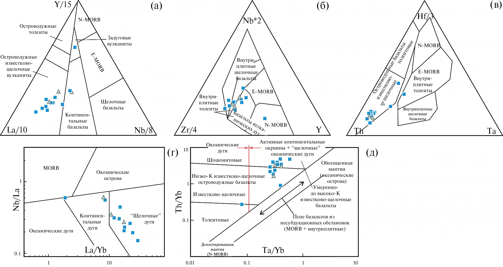 Рис. 9. Дискриминационные диаграммы для амфиболитов донской серии: (а) — (Cabanis et Lecolle, 1989); (б) — (Meschede, 1986); (в) — (Wood, 1980); (г) — (Hollocher et al., 2012); (д) — (Pearce, 1982) .