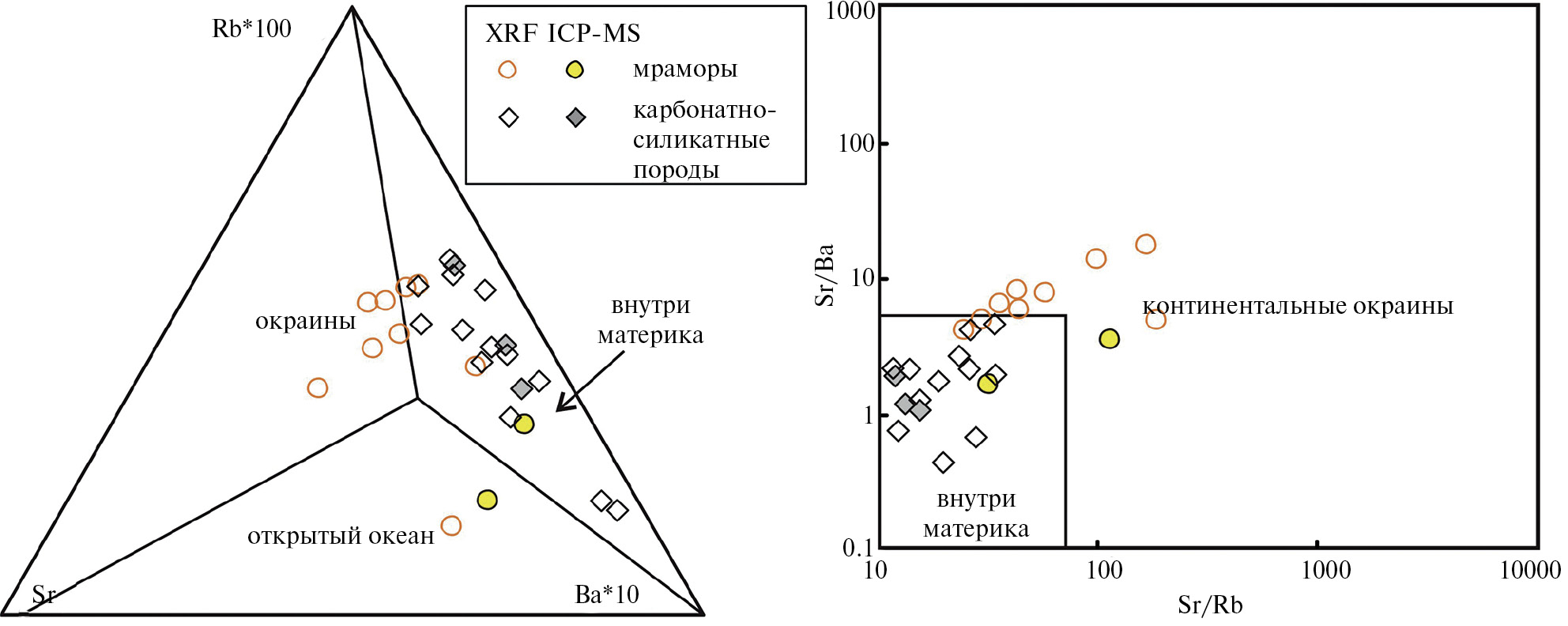 По метаосадочным породам также осуществлена попытка оценки геодинамических условий формирования. Использованы дискриминационные диаграммы для известняков различных тектонических обстановок (Zhang et al., 2017). Мы отдаем себе отчет об отсутствии “чистых” мраморов в донской серии, и примесь силикатной составляющей сильно нарушает концентрации редких элементов, однако их соотношения могут остаться постоянными. Мраморы и карбонатно-силикатные породы (по данным ICP-MS и XRF) донской серии попадают в поля континентальных окраин и внутренних частей континентов (рис. 10), что может отражать их промежуточное тектоническое положение. Однако контрастные положительные Eu-аномалии на графиках, нормализованных к постархейским австралийским сланцам, характерные для известняков внутренних частей континентов, отсутствуют в мраморах и карбонатно-силикатных породах донской серии.