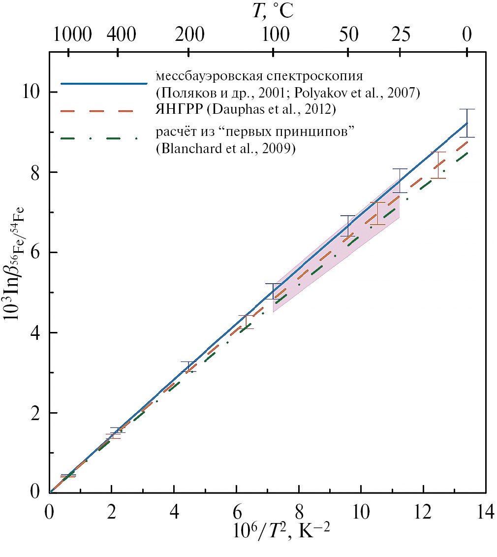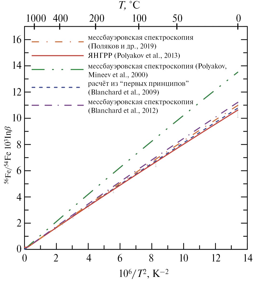 Металлическое железо (α-Fe) | 0.49952 | –1.0882 | 3.8340 | Настоящая статья; Polyakov, Mineev, 2000; Schauble et al., 2001; Polyakov et al., 2007; Dauphas et al., 2012, 2017 |
