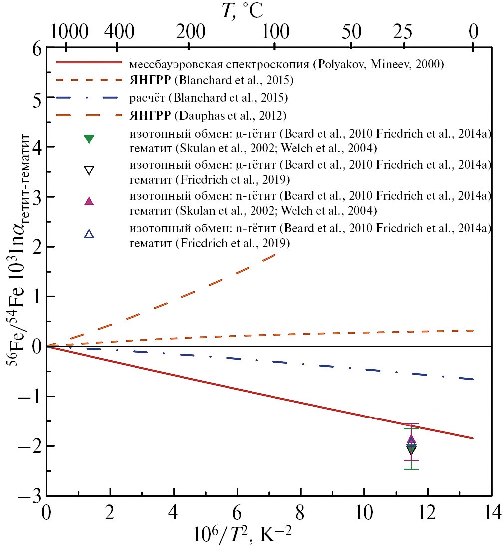 Гетит (α-FeOOH) | 0.53042 | –1.2504 | 4.5855 | Поляков, Минеев, 1999; Polyakov, Mineev, 2000; Beard et al., 2010; Frierdich et al., 2014a |