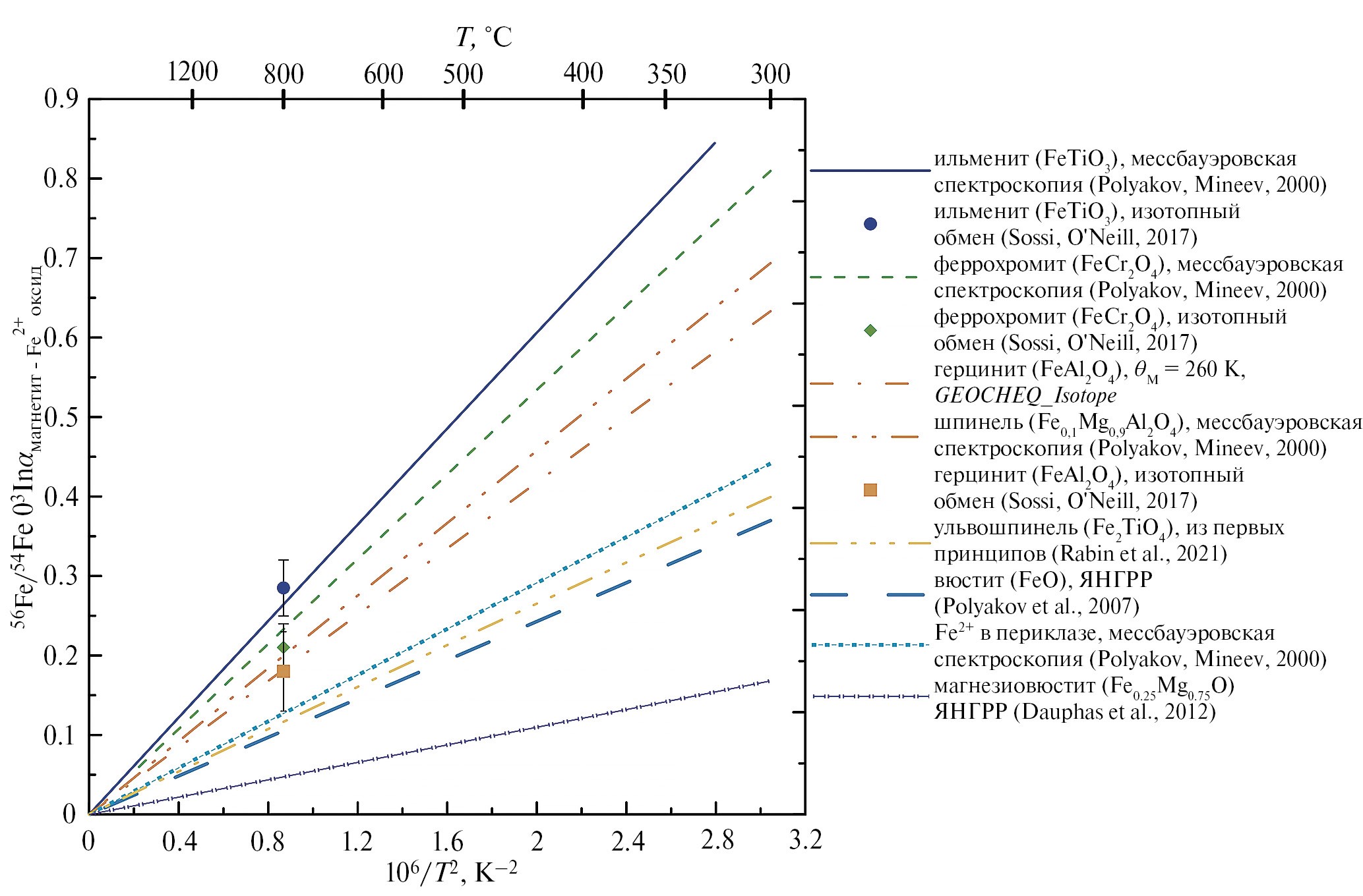 Феррохромит (FeCrO3) | 0.30781 | –0.39906 | 0.88048 | Поляков, Минеев, 1999; Polyakov, Mineev, 2000; Sossi, O’Neill, 2017 |