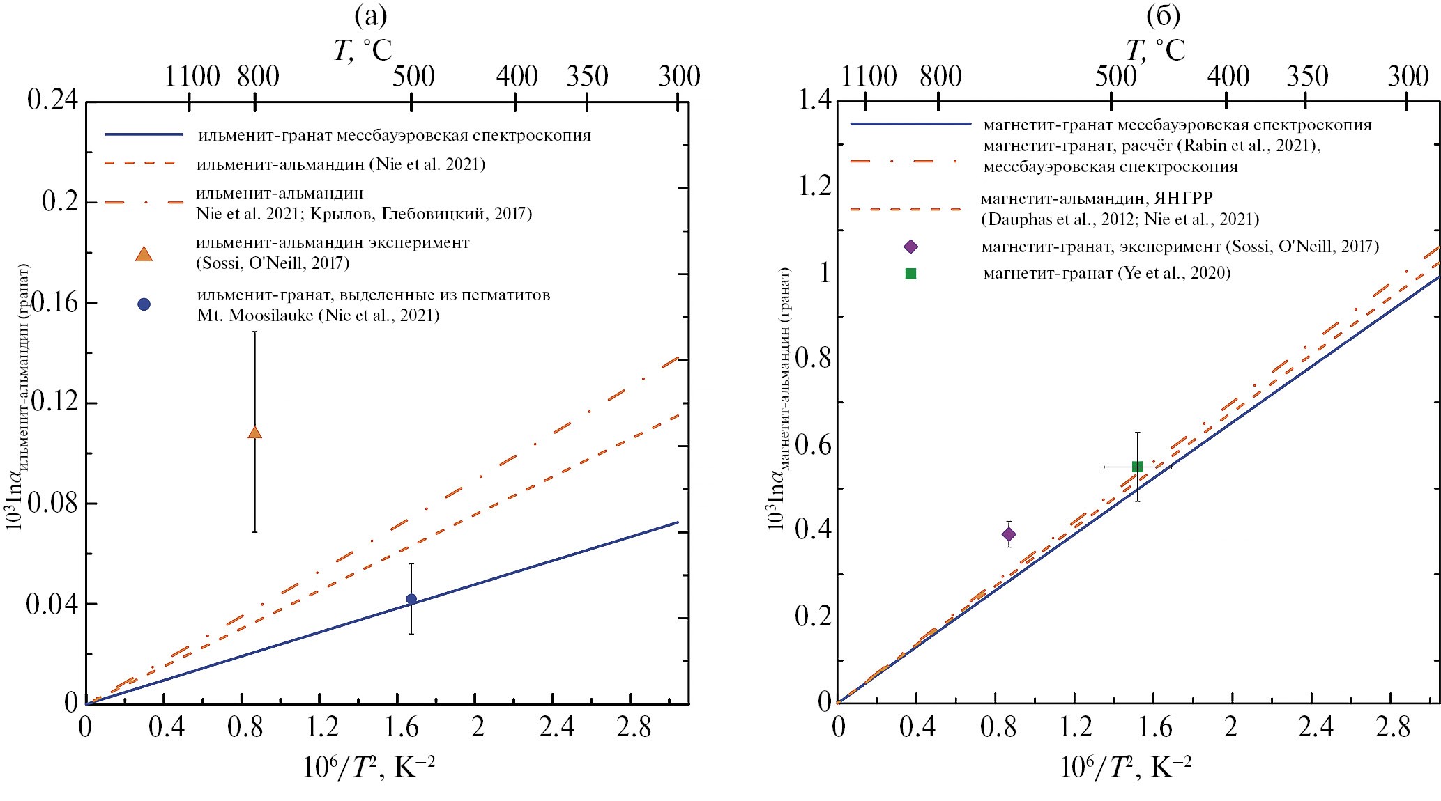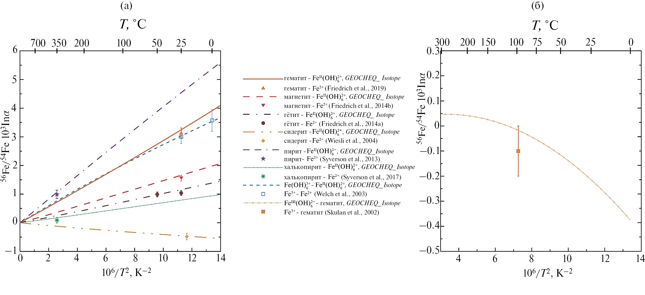 Также, как и в случае углеродных и кислородных изотопных эффектов (Mironenko et al., 2018; Поляков и др., 2021), точность и обоснованность расчетов по изотопным равновесиям с участием железа определяется точностью данных по β-факторам железа для минералов, которые используются в программном комплексе GEOCHEQ_Isotope. Для оценки равновесных изотопных факторов фракционирования изотопов железа применяют как теоретические, так и экспериментальные методы. Теоретические расчеты β-факторов железа в подавляющем большинстве проводятся из “первых принципов” на основе метода функционала плотности (Schauble, 2004; Blanchard et al., 2009, 2017; Rustad et al., 2010; Fujii et al., 2014; Johnson et al., 2020). Экспериментальные определения равновесных коэффициентов разделения изотопов железа используют предложенный Нортропом-Клейтоном (Northrop, Clayton, 1966) метод частичного изотопного обмена и впервые использованный Matsuhisa et al. (1978) трехизотопный метод (Welch et al., 2003; Wiesli et al., 2004; Schuessler et al., 2007; Shahar et al., 2008; Syverson et al., 2013; Frierdich et al., 2014a,b; Pokrovski et al., 2021). При этом трехизотопный метод измерения для железа является наиболее распространенным.