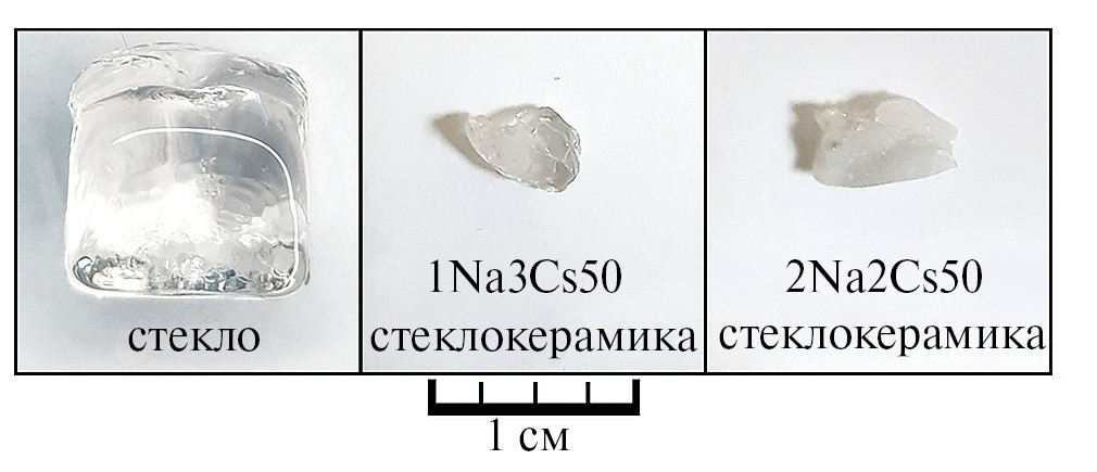Рис. 2. Фото образцов стекла 1Na3Cs50 и стеклокерамических материалов составов 1Na3Cs50 и 2Na2Cs50.