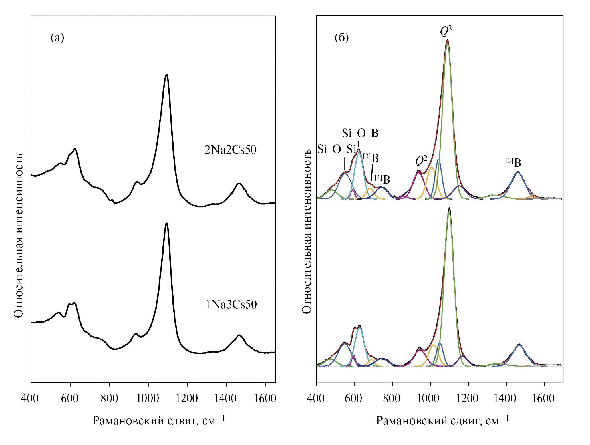 Рис. 3. Спектры комбинационного рассеяния исходных стекол системы 30(Na2O+Cs2O)·20B2O3·50SiO2, содержащих натрий и цезий в различных соотношениях (а). Разложение спектров комбинационного рассеяния на суперпозицию линий (б). Q2 – тетраэдры SiO4 с двумя немостиковыми атомами кислорода; Q3 – тетраэдры SiO4 с одним немостиковым атомом кислорода; [3]B – структурные единицы, содержащие трехкоординированные атомы бора; [4]B – структурные единицы, содержащие атомы бора в четвертной координации.