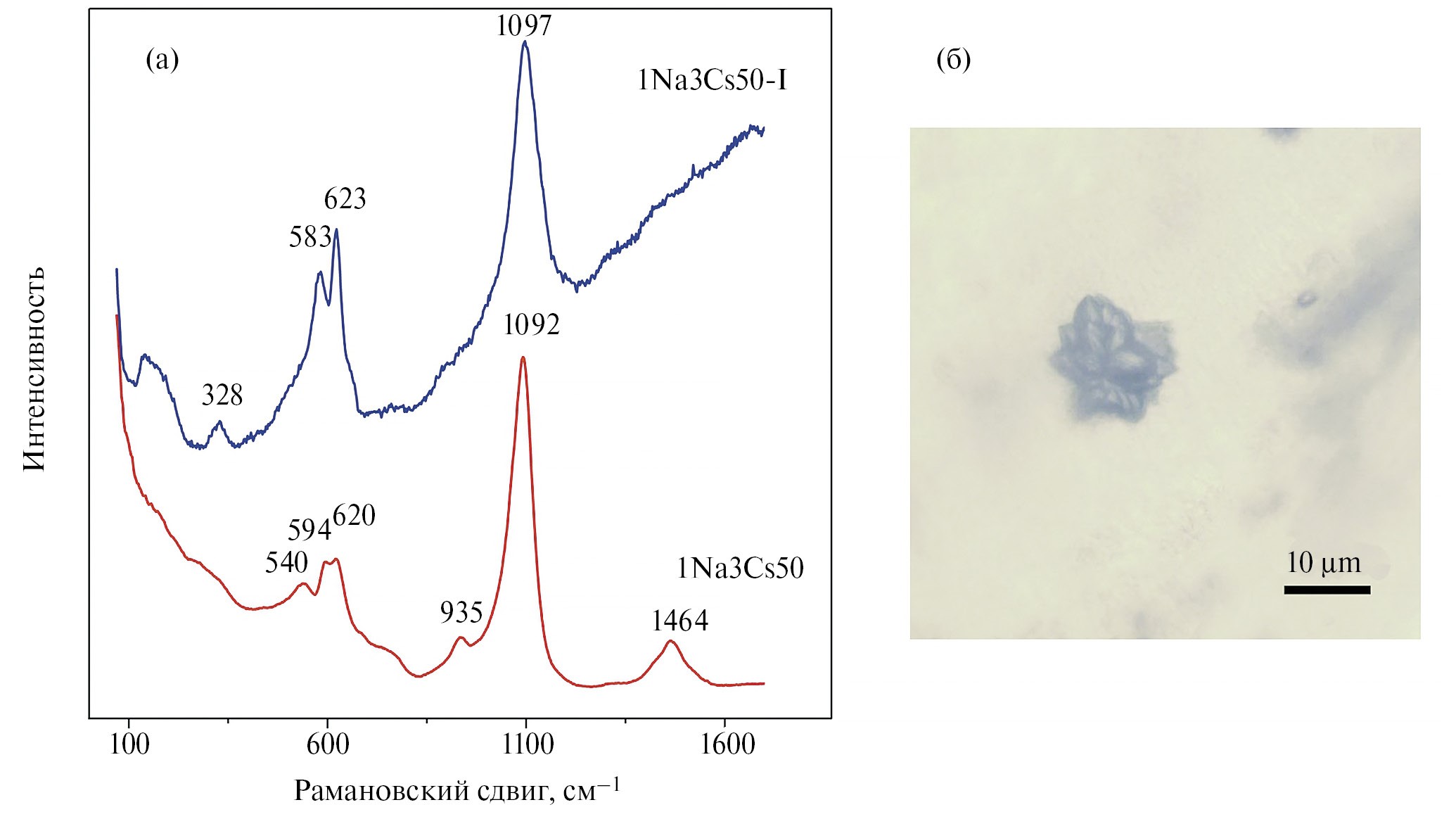 Рис. 5. Спектры комбинационного рассеяния стекла состава 1Na3Cs50 и стеклокерамического материала 1Na3Cs50-I, полученного из расплава при термической обработке согласно режиму № 1 (a). Оптическое изображение стеклокерамики 1Na3Cs50-I (б).