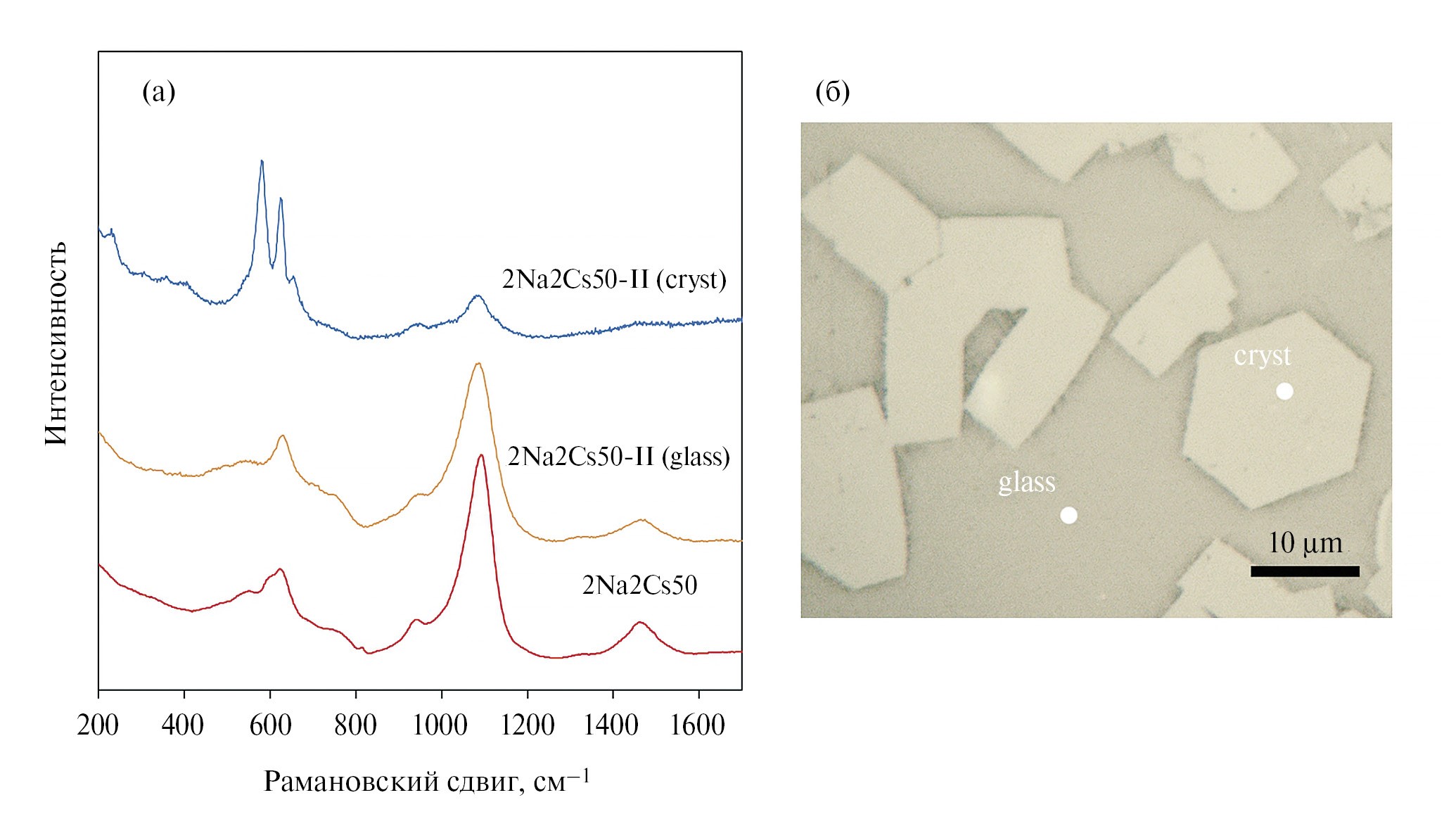 Рис. 6. Спектры комбинационного рассеяния стекла состава 2Na2Cs50 и стеклокерамического материала 2Na2Cs50-I, полученного из расплава согласно режиму № 1 (а). Оптическое изображение стеклокерамики 2Na2Cs50-I (б).