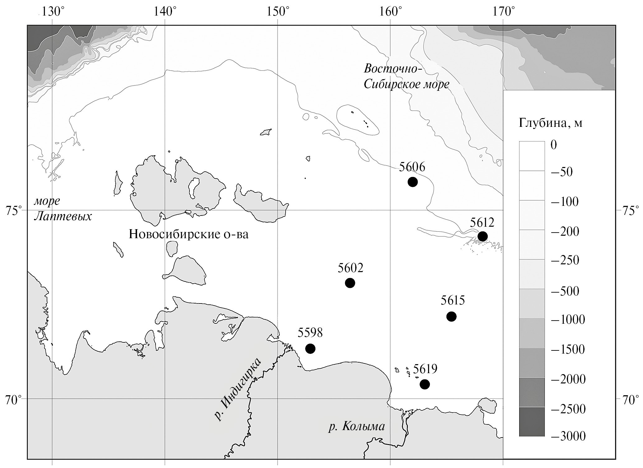 Индигирский разрез включал станции 5598, 5602 и 5606 (глубина моря от 13.6 до 48 м). В северной части этого разреза (ст. 5606) вблизи кромки льда растворенный кислород показал максимальное значение (7.80 мл/л) вследствие опускания здесь холодных насыщенных кислородом вод. Субстрат фауны представлен вязко-текущим пелитом и алевро-пелитом, с примесью тонко-зернистого песка на самой мелководной станции (табл. 2). На мелководной ст. 5598 траловая проба соответствовала широко распространенному в сибирском секторе Арктики сообществу Bivalvia Portlandia arctica, характерному для приэстуарных мелководий. На более глубоководных станциях 5602 и 5606 доминировали офиуры Ophiocten sericeum, занимающие обширные площади шельфа на акватории всех сибирских морей. Подобные сообщества развиваются в диапазоне глубин ~ 30–100 м в районах, лишенных влияния пресного стока. В этих интервалах глубин обнаружено также значительное количество ракообразных Isopoda – морских тараканов Saduria sabini. Для станций Индигирского разреза характерны низкие показатели численности и биоразнообразия: число видов не превышает 26, а максимальная численность достигает лишь 140 экз./0.1 м2. Наблюдаются тренды падения численности и увеличения биоразнообразия по мере удаления от дельты р. Индигирка.