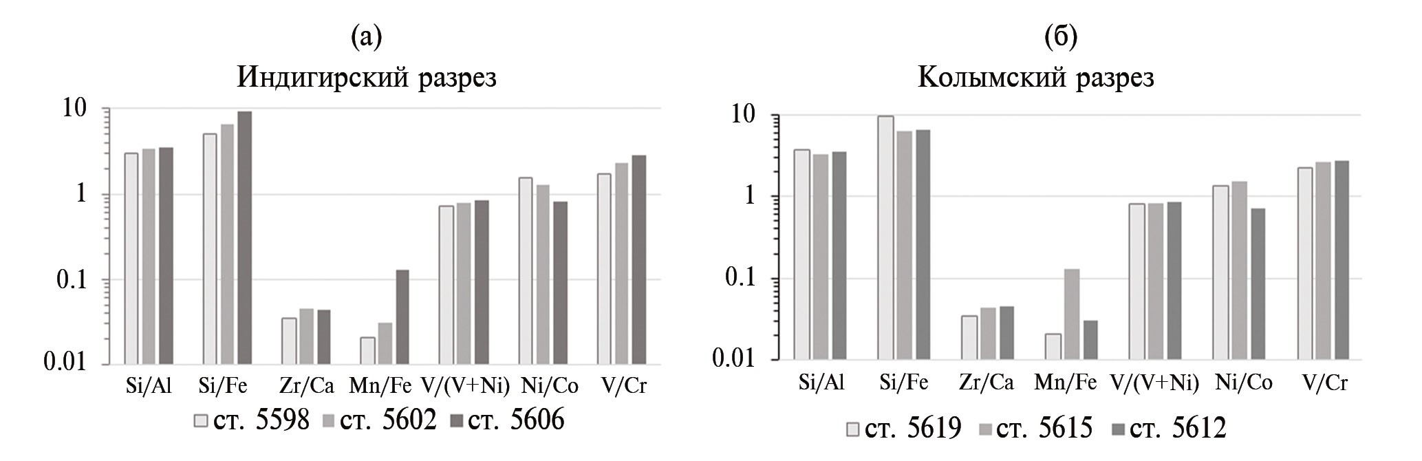 На всех станциях среднее значение комплекса элементных отношений V/(V+Ni) < 1, Ni/Co < 5 и V/Cr < 2 (Jones, Manning, 1994) характеризует окислительные условия в верхнем слое осадков, что соответствует высокой насыщенности кислородом придонных вод (слой 0–15 см) (табл. 2). Незначительное возрастание отношения Si/Fe наблюдается в северной части Индигирского разреза (ст. 5598, рис. 5а) и южной части Колымского разреза (ст. 5619, рис. 5б), что, по-видимому, обусловлено повышенным здесь по сравнению с другими станциями содержанием песчаной фракции (табл. 5). С песчаной фракцией коррелирует Si (r 0.46, р < 0.05), a Fe, напротив, тяготеет к алевритопелитовой фракции (r 0.47, р < 0.05), причем распределение песчаной фракции нa двух разрезах имеет противоположный характер. Кроме этого, в осадках ст. 5606 и 5615 заметно возрастает по сравнению с другими станциями отношение Mn/Fe, что свидетельствует об относительном повышении доли гидроксидов Mn, что способствует возрастанию пропорции адсорбированного комплекса элементов и соответственно повышению их биодоступности.