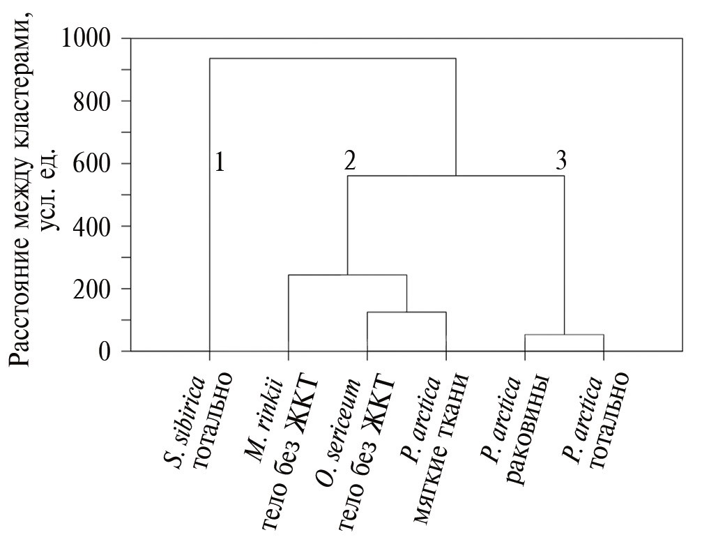 Кластер 1 включает в себя только один таксон – собирающий эврифаг-хищник изопода Saduria sibirica. В этом выражается отличие данного вида ракообразных от других групп организмов: максимальные содержания Mn и Cu, и повышенные – Cd, Сo, Zn, Ag и As (табл. 3) в сочетании с повышенным содержанием Cорг (31.9 %, табл. 4). В кластер 2 объединяются мягкие ткани двустворчатого моллюска Portlandia arctica, тело офиуры Ophiocten sericeum без желудка и тело голотурии M. linkii без кишечника. Отличительной чертой этих организмов от других является повышенное содержание Cорг с максимальным значением (43.37 %) в мягких тканях P. arctica. Вторым отличием этой группы организмов являются максимально высокие концентрации тяжелых металлов Cd, Ni, Pb и Bi, в несколько раз превышающие таковые в других организмах. С другой стороны, содержания Mn и Ва понижены в мягких тканях данных организмов. В кластер 3 входят раковины и целые тела двустворок, а также тела без желудков офиур, которые характеризуются низким содержанием Сорг (от 1.2 % до 5.9 %), но повышенным Скарб (от 10.3 % до 11.8 %). Раковины двустворок и офиуры в значительной мере (85–98 %) состоят из карбоната кальция. Это соответствует основному вкладу карбонатных биоминералов в вариативность элементов, Сорг и Скарб в донных экосистемах. Минимальное из исследуемых проб бентоса содержание Cорг в раковинах обусловливает низкие содержания в них тяжелых металлов Ag, Cd, Cr, Th, Zn, U и As. В свою очередь, раковины и тотальные пробы P. arctica отличаются высокими концентрациями Ba (21.25 мкг/г) и Tl (0.02 мкг/г).