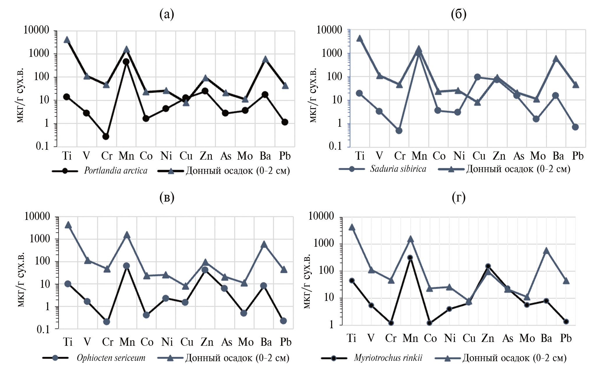 Рис. 7. Сопоставление распределения элементов в поверхностных осадках и донных организмах, включая целое тело двустворчатого моллюска P. arctica (а), целое тело изоподы Saduria sibirica (б), тело без желудков/кишечников офиуры Ophiocten sericeum (в) и голотурии Myriotrochus rinkii (г).
