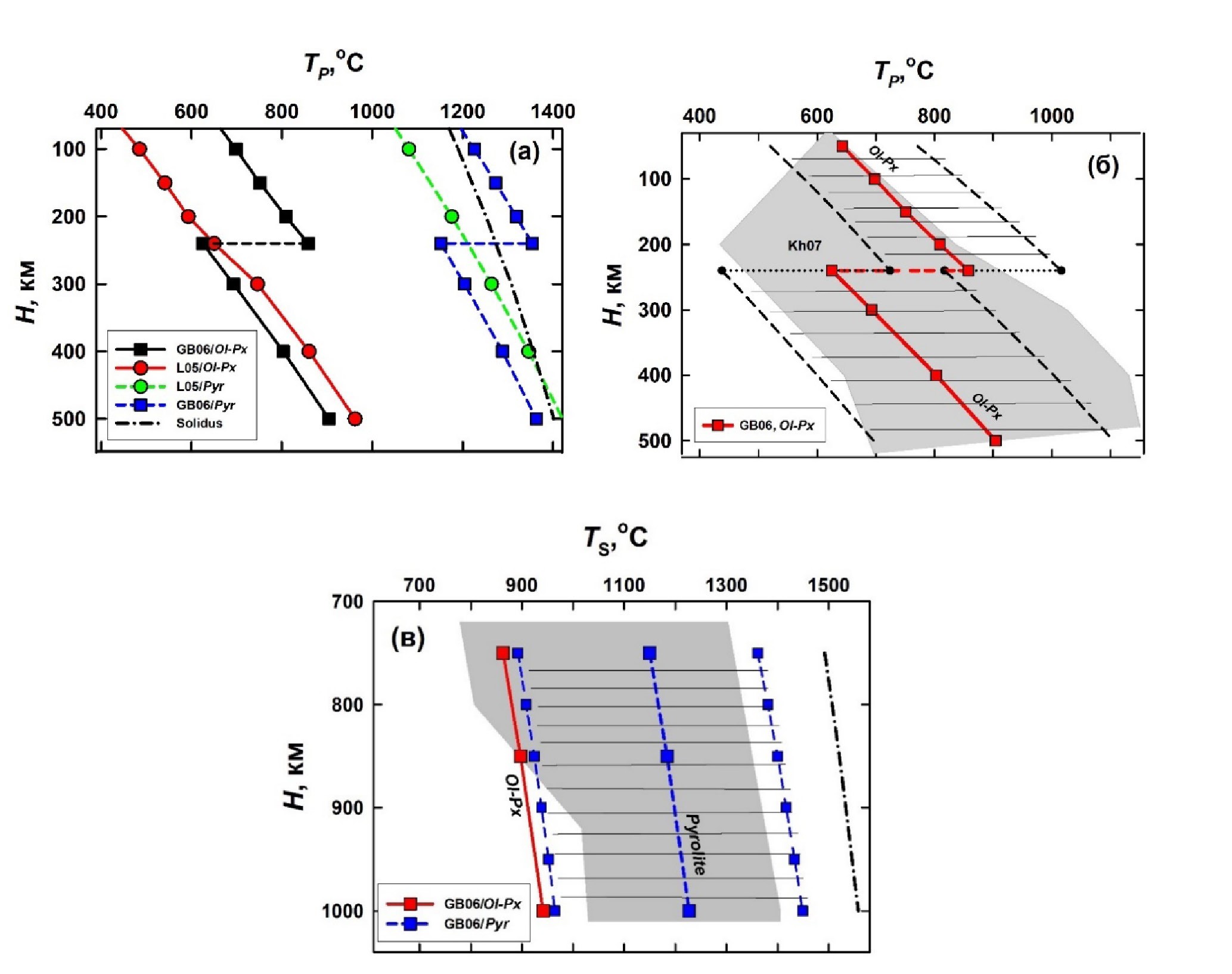 Температура | T150 km = 600°С, T1000 km ∈ [950; 1350°С] | (Kuskov et al., 2019a; Kronrod et al., 2022) |