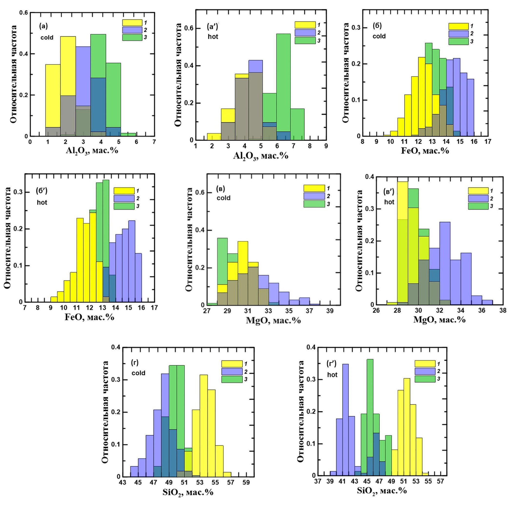 Модели состава, мас. % модели E модели M FeO | CE(Al2O3) = 4.05 ± 0.36% CM(Al2O3) = 5.91 ± 0.39% CE,M(FeO) = 12.25 ± 1.33% | (Kronrod et al., 2022) |