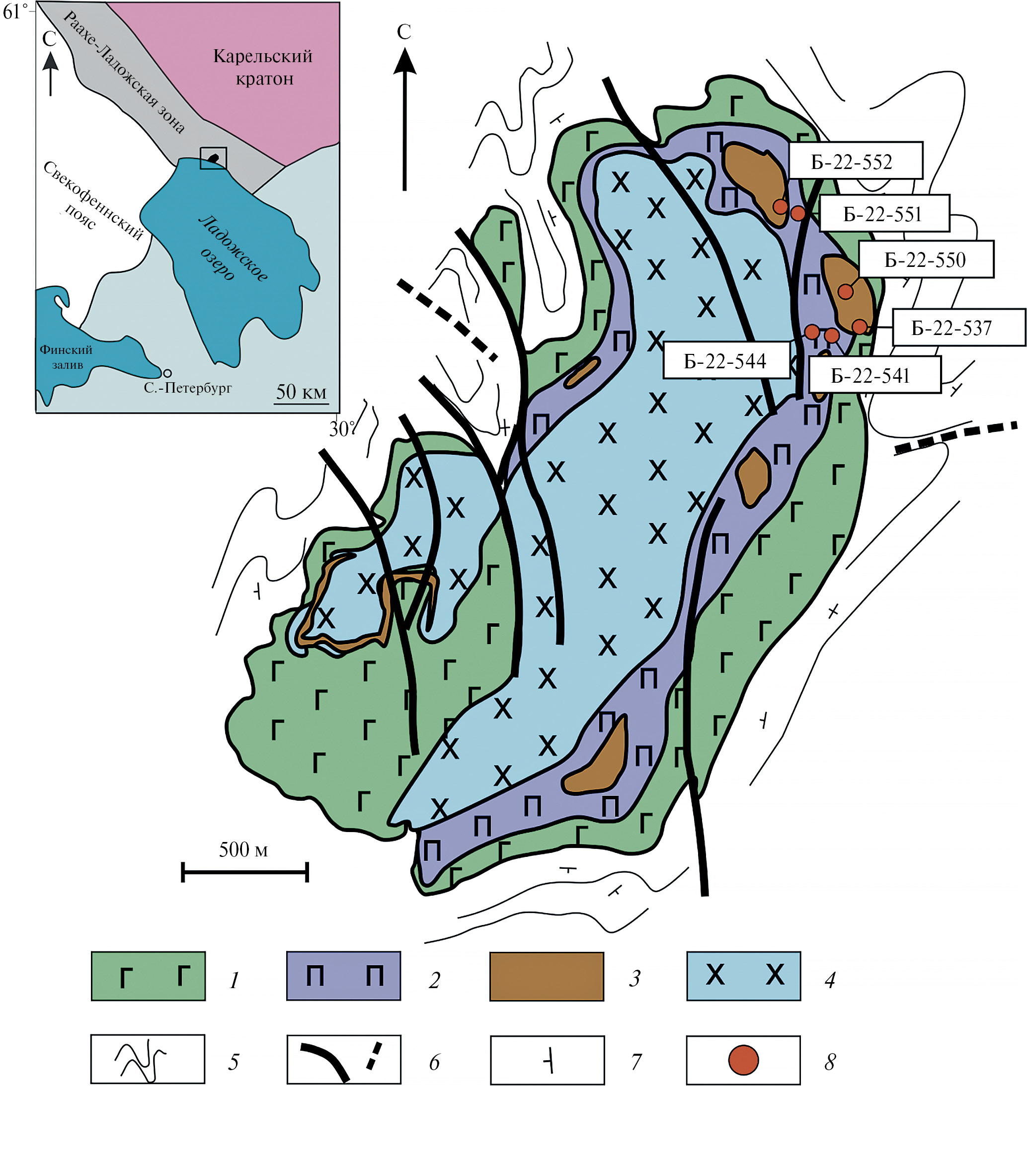 1–4 – породы Велимякского массива: 1 – габбро (зона трахитоидных габбро); 2 – габбро и диориты с телами пироксенитов (габбро-пироксенитовая зона переслаивания пород); 3 – рудовмещающие тела клинопироксенитов; 4 – габбро-диориты (габбро-диоритовая зона); 5 – вмещающие сланцы ладожской серии; 6 – тектонические нарушения достоверные и предполагаемые; 7 – элементы залегания сланцеватости; 8 – места отбора образцов и их номера.