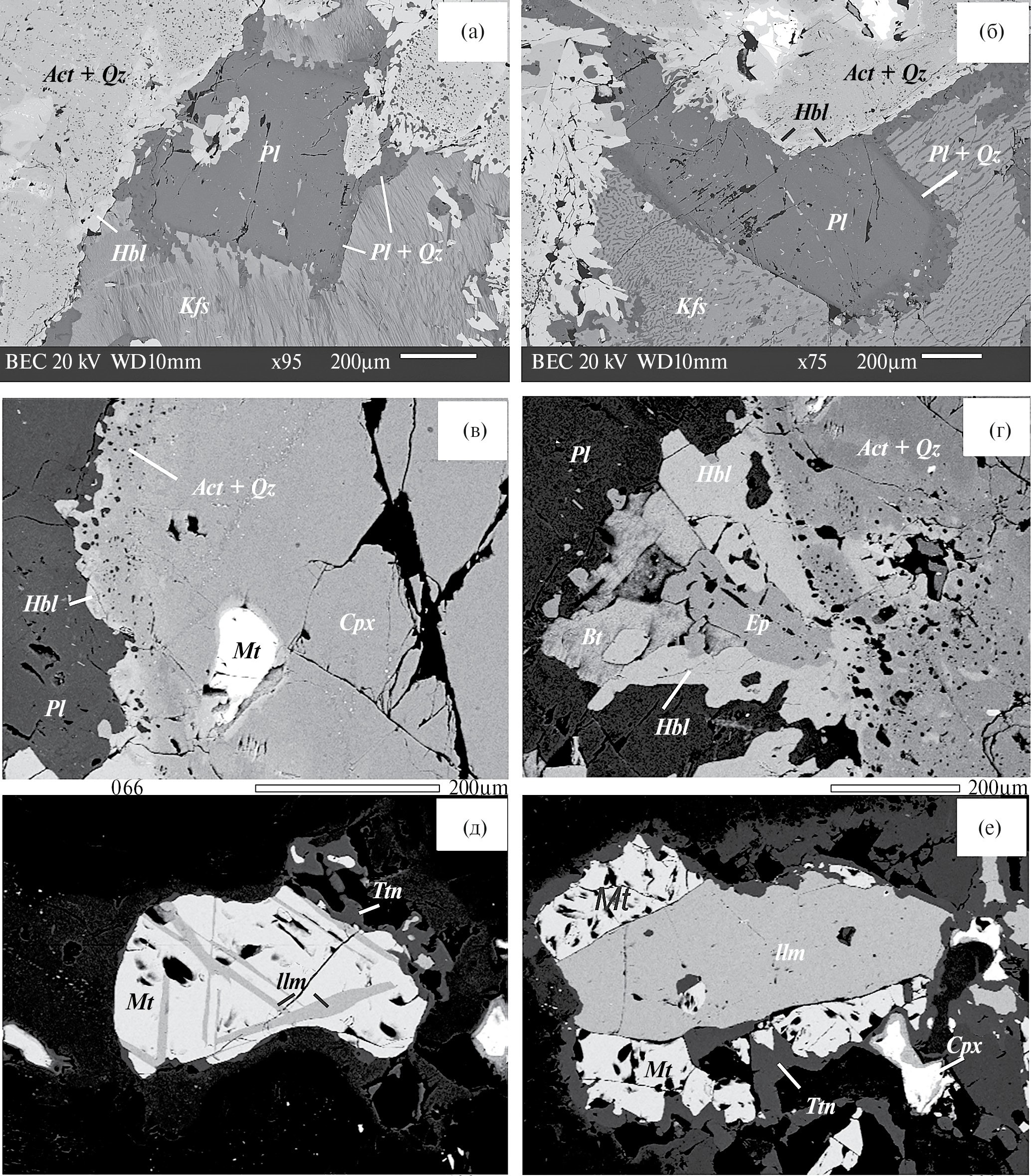 (а, б) – реакционные взаимоотношения калиевого полевого шпата и плагиоклаза; (в, г) – роговообманковые (иногда с биотитом и эпидотом) каймы вокруг актинолитовых псевдоморфоз по клинопироксену; (д, е) – зерна магнетита с ламелями распада, сложенными ильменитом, вокруг зерен развивается титанит.