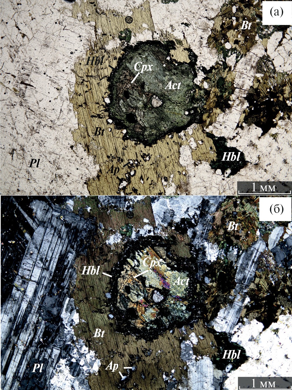 Рис. 4. Фотография шлифа монцодиорита в параллельных (а) и скрещенных (б) николях, где видна последовательность замещения магматического клинопироксена актинолитовым (± кварц) агрегатом и развитием роговой обманки по актинолиту. Зерна апатита часто встречаются в ассоциации с роговой обманкой и вторичным биотитом.