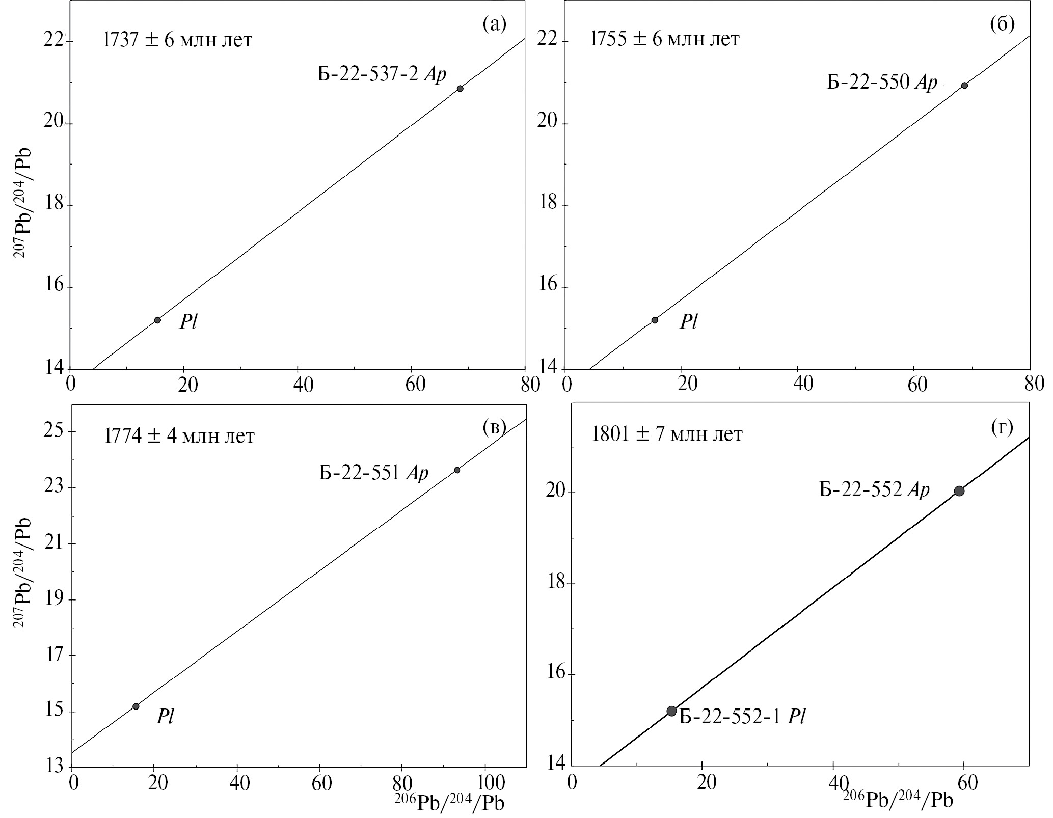 Рис. 7. Двухточечные Pb-Pb изохроны для апатитов пород первой фазы внедрения массива Велимяки.