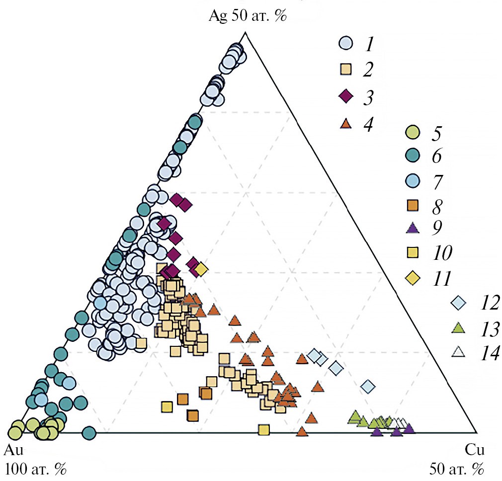 1–4 – месторождение Чудное (Онищенко, Кузнецов, 2023): 1 – одна фаза (Au–Ag–Cu), 2 – две фазы (Au3Cu + Au–Ag–Cu), 3 – две фазы (AuCu + Au–Ag–Cu), 4 – три фазы (Au3Cu + AuCu + Au–Ag–Cu); 5 – рудопроявление Нестеровское – одна фаза (Au–Ag–Cu); 6 – аллювиальные отложения Пуйвинского района – одна фаза (Au–Ag–Cu); 7–9 – терригенные породы нижнего палеозоя на р. Малая Кара: 7 – одна фаза (Au–Ag–Cu), 8 – две фазы (Au3Cu + Au–Ag–Cu); 9 – две фазы (Au3Cu + AuCu); 10, 11 – аллювиальные отложения Кыввожского района: 10 – две фазы (Au3Cu + Au–Ag–Cu) и одна фаза (Au3Cu), 11 – две фазы (AuCu + Au–Ag–Cu); 12–14 – месторождение Золотая Гора: 12 – две фазы (Au3Cu + Au–Ag–Cu) (Спиридонов, Плетнев, 2002), 13, 14 – две или три фазы (подробнее в тексте), 13 – Спиридонов, Плетнев, 2002, 14 – Murzin et al., 2018.