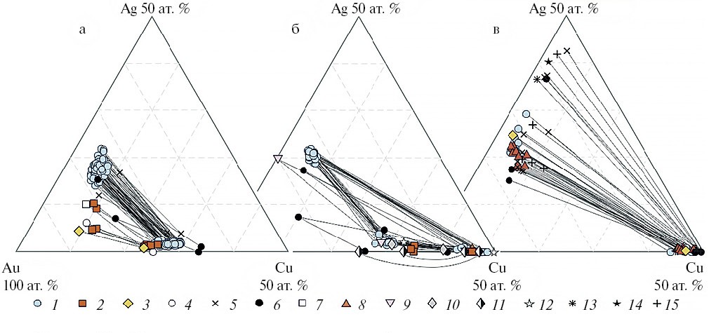 1 – месторождение Чудное, Приполярный Урал (Онищенко, Кузнецов, 2022); 2 – терригенные отложения нижнего палеозоя на р. Малая Кара (настоящее исследование); 3 – аллювиальные отложения Кыввожского района, Тиман (настоящее исследование); 4 – россыпь на р. Кундусуг, Тыва (Хертек, Сазонов, 2023); 5 – россыпь Уитон-Крик и рудопроявление 15-я миля, Канада (Knight, Leitch, 2001); 6 – россыпь Кондерского щелочно-ультраосновного массива (Некрасов и др., 2001); 7 – межрудные сланцы Лебединского месторождения, КМА (Резникова, Кузнецов, 2018); 8 – месторождение Золотая Гора (Спиридонов, Плетнев, 2002); 9 – месторождение Золотая Гора (Murzin et al., 2018); 10 – Норильское месторождение (Sluzhenikin, Mokhov, 2015), в составе фаз учтено наличие Pd (Au+ Pd); 11 – Скаергардский массив, Гренландия (Рудашевский и др., 2014), в составе фаз учтено наличие Pd (Au+ Pd); 12 – река Кокихалла (Coquihalla), Британская Колумбия, Канада (Chapman et al., 2023); 13 – россыпь Гулинского щелочно-ультраосновного массива (Сазонов и др., 1994); 14 – месторождение Таррет (Turret), Западная Австралия (Voute, Thebaud, 2015); 15 – россыпь на р. Ольховатая-1, Камчатка (Palyanova et al., 2024).