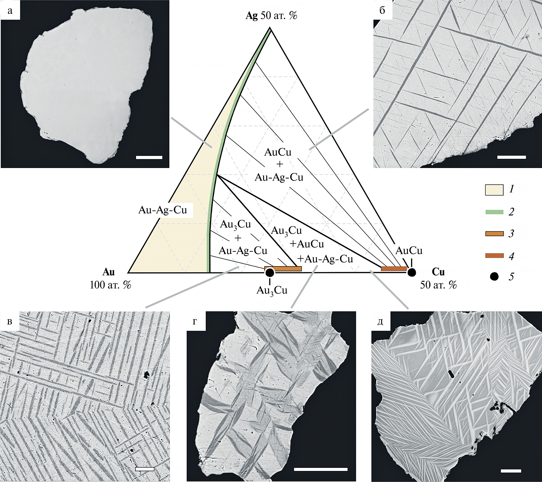 Самородное золото в зависимости от валового состава при понижении температуры сохраняет первичное гомогенное строение (1) или приобретает характерные структуры распада Au–Ag–Cu-твердого раствора. Состав фаз в структурах распада (2–4): 2 – Au–Ag–Cu-твердый раствор, 3 – фаза Au3Cu, 4 – фаза AuCu. 5 – точки, соответствующие стехиометрическим соединениям Au3Cu и AuCu. а, д – самородное золото из терригенных пород нижнего палеозоя на р. Малая Кара, б-г – самородное золото месторождения Чудное. Полированные шлифы, изображения в отраженных электронах, более медистые фазы выглядят темнее. Масштабная линейка 10 мкм.