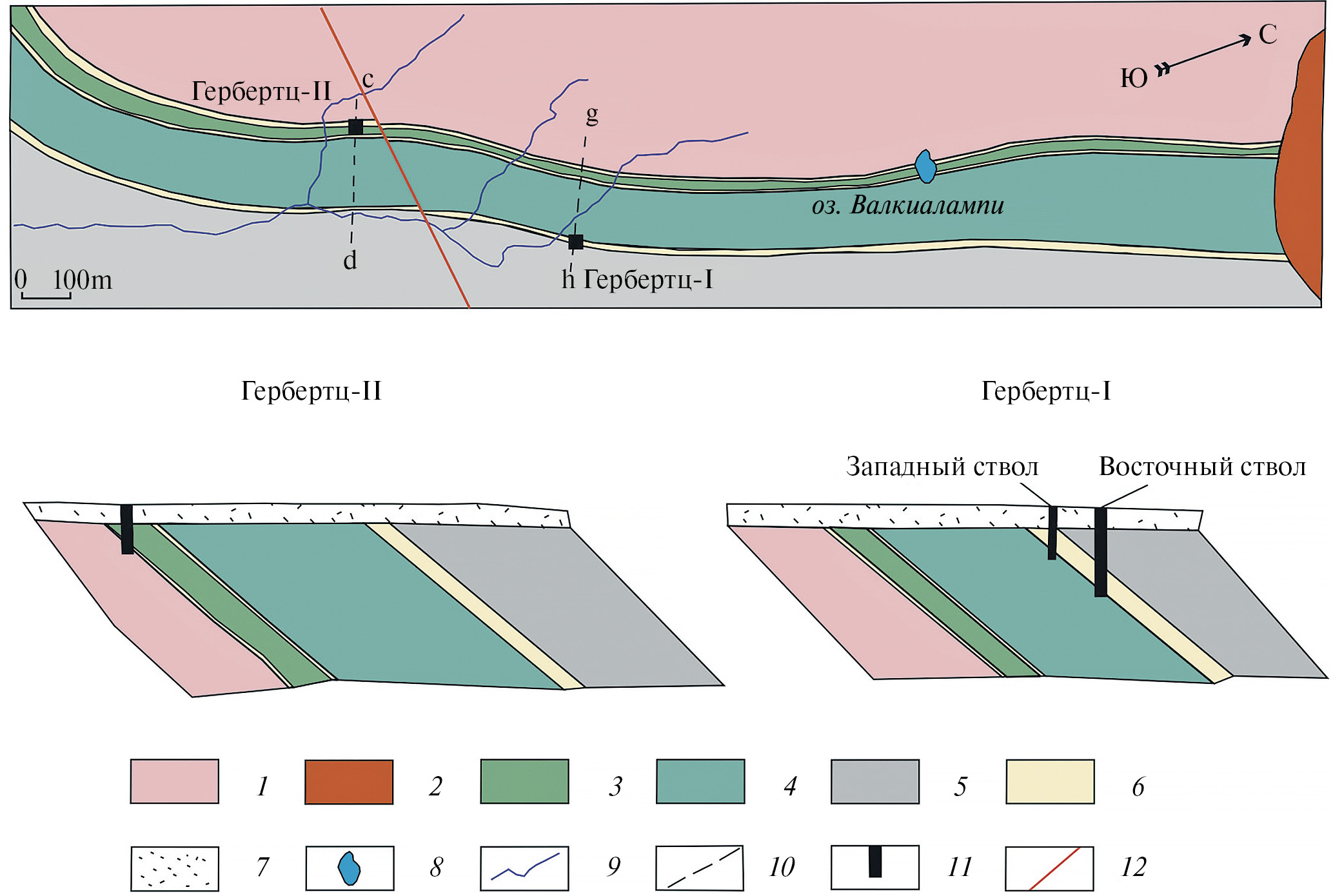 Рис. 2. Геологическая карта района рудника «Гербертц» и разрезами по ней (на основе Trüstedt, 1907) с изменениями авторов. 1 – гранитогнейсы, 2 – граниты, 3 – актинолитовые сланцы, 4 – амфиболитовые сланцы, 5 – слюдистые сланцы, 6 – скарны, развитые по мраморам, 7 – рыхлые отложения, 8 – озеро, 9 – реки, 10 – линии разрезов, 11 – шахтные стволы, 12 – разрывные нарушения.