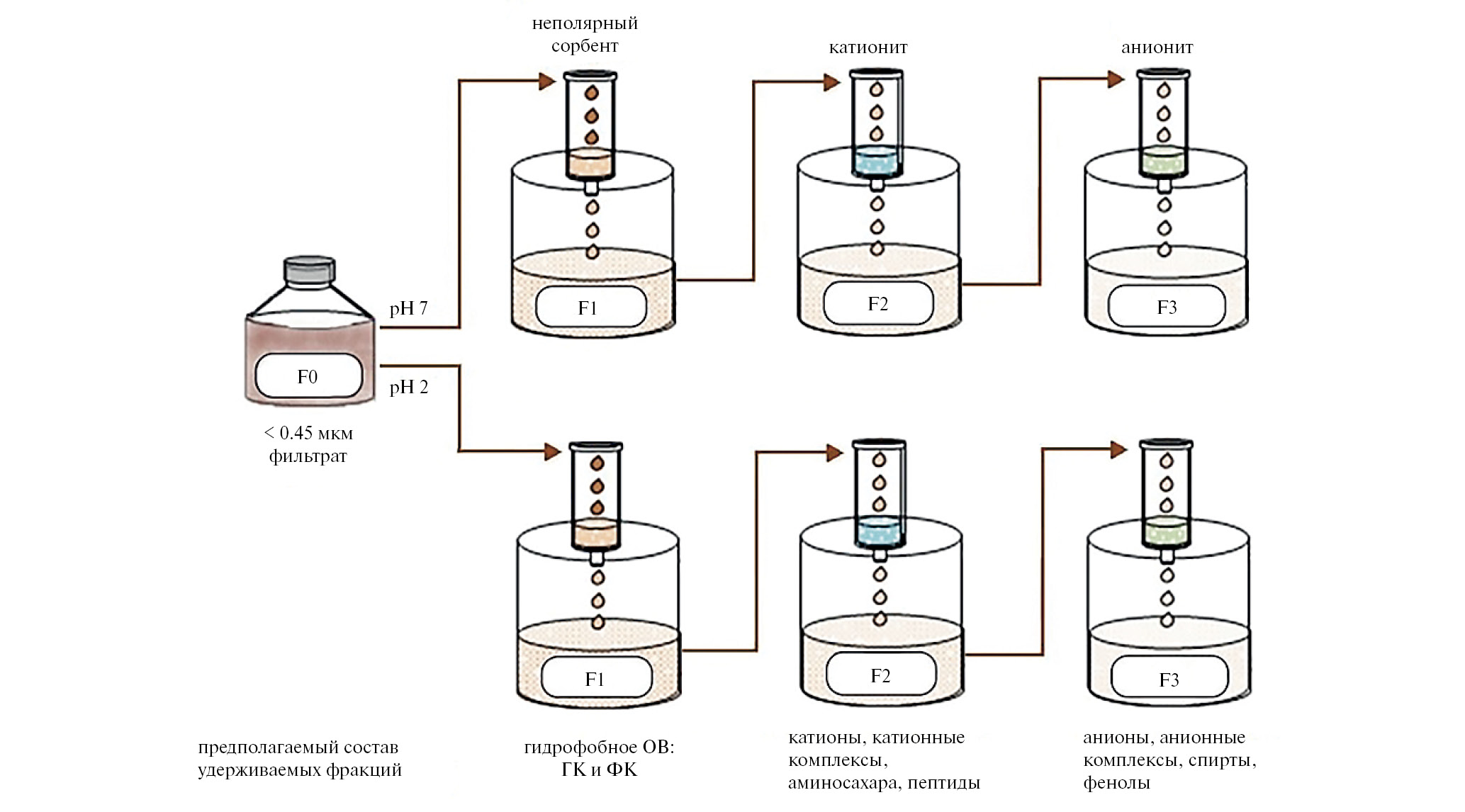 Дополнительно проведена параллельная серия фракционирования при рН равном 2, для оценки доли прочносвязанных с ОВ металлов. Значения рН корректировались растворами HCl и NaOH. Доля форм нахождения в экспериментах оценивалась по разнице концентраций между фракциями и отношением к их общему содержанию во фракции F0. В случае недостоверных отличий между фракциями (только для ионобменных смол), смолы после эксперимента промывалась небольшим объемом 10M HNO3 и в элюате определялось содержание элементов и рассчитывался масс-баланс. Сумма фракций с учетом масс-баланса в экспериментах менялась от 87 до 107 %. Использовались реагенты классификации «for ultratrace analysis» и деионизованная вода Milli-Q Millipore (<1 мкг/л по растворенному Сорг), 18.2 MΩ/cm. Масс-спектрометрические измерения растворов после фракционирования проведены на приборе PlasmaQuant MS Elite. Правильность измерений концентраций элементов оценивали методом введено-найдено с использованием растворов High Purity Standards ICP-MS-68 с введением добавки в те же образцы в качестве матрицы в пределах 50–200 % от истинного содержания элементов в пробах. Выход добавки составлял от 89 до 106 %.