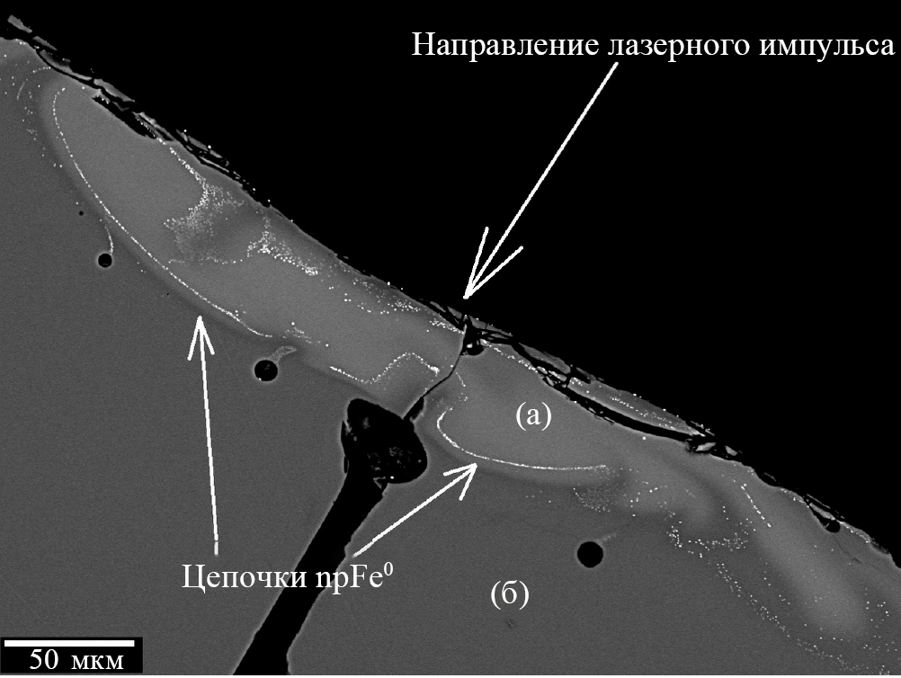 Изучение природы образования нанофазного железа не прекращается с момента доставки лунного грунта на Землю. Однако, несмотря на многочисленные публикации о нанофазном железе (npFe0), вопрос о его происхождении остается спорным. Исследование расплавленных продуктов в лазерных экспериментах, имитирующих удар микрометеорита по базальту, перидотиту, оливину и пироксеновым мишеням, показало, что после облучения миллисекундным лазерным импульсом в мишенях формируются цепочки и россыпи npFe0. Таким образом, вероятно, существует иной механизм термического восстановления и образования нанофазного железа в расплавах железосодержащих минералов и пород.