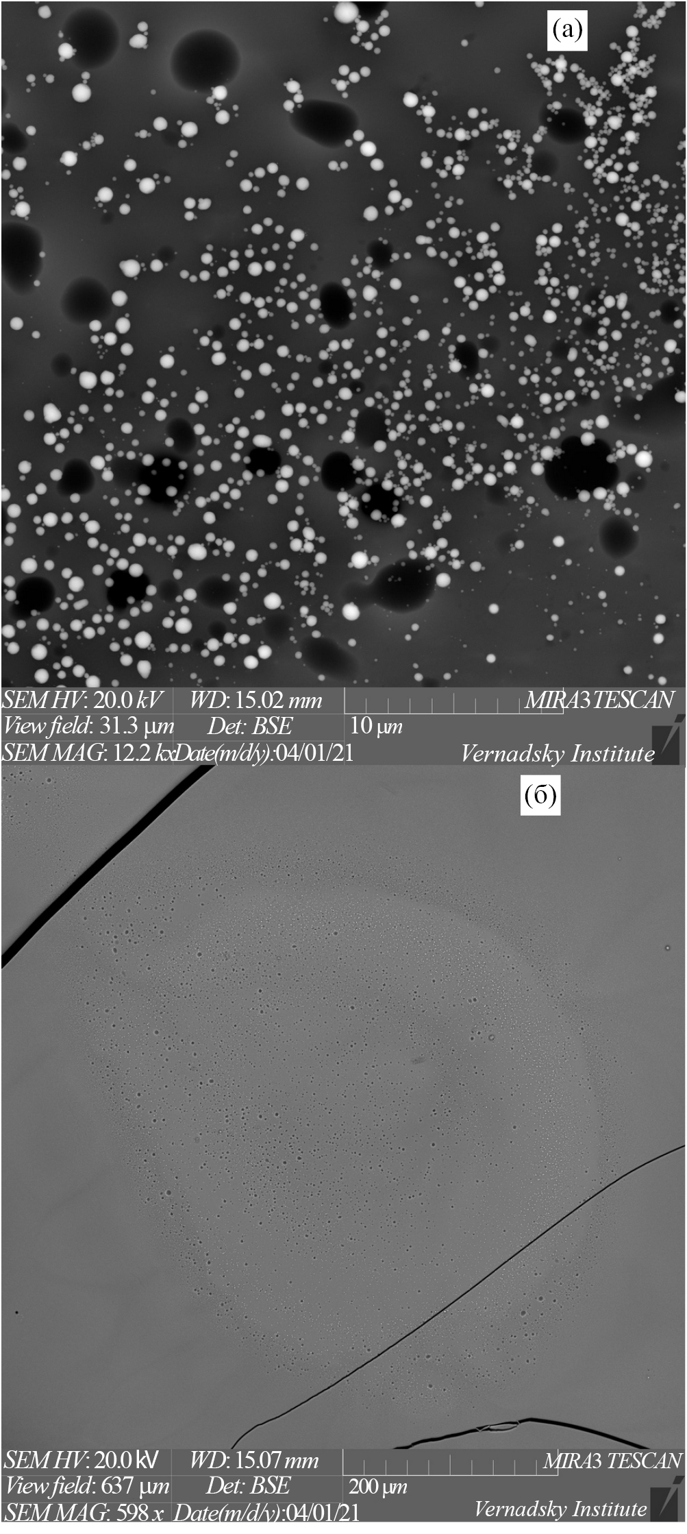 Рис. 9. Нанофазовые глобулы железа (светлые включения) и пузырьки газа (черные точки) в перидотитах (SEM) на снимках с разным увеличением (a, б).