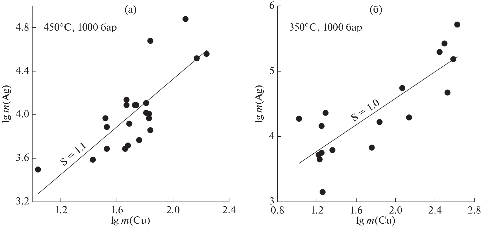 The coupled solubility of Cu(cr) and Ag(cr) was measured in acidic chloride solutions at 350 °С/1000 bar, 450 °С/1000 bar and 653 °С/1450 bar in a wide range of chloride concentrations (0.02m HCl + (0-15m) NaCl). The experiments were performed using autoclave (350, 450 °С) and ampoule (653 °С) techniques, the dissolved metal concentrations were measured after quenching the experimental system. The equilibrium constants of the reaction combining the dominant forms of transport of the metals are determined