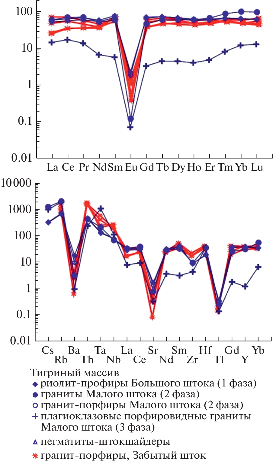 The present paper considers petrographic and geochemical features of rocks of the Tigrinoe and Zabytoe stocks, provides their mineral composition, the results of the detailed study of micas and mineral-forming inclusions in quartz. It is shown that the development of ore-magmatic systems (OMSs) of the Zabytoe and Tigrinoe deposits is associated with the same rare-metal Li–F melts. It is confirmed that granitoids of the Tigrinoe stock can be considered as more differentiated analogs of granitoids of the Zabytoe stock. New data concerning the differences in the history of the magmatic stage of development of the OMSs of these deposits are presented. The evolution of melts of both deposits took place at high fluid pressure. Differences in the scale of ore mineralization of the two RMSs under consideration could be due to different fluid regime of magmatic sources evolution and more significant participation of transmagmatic fluid flows in the development of the Tigrinoe OMS.