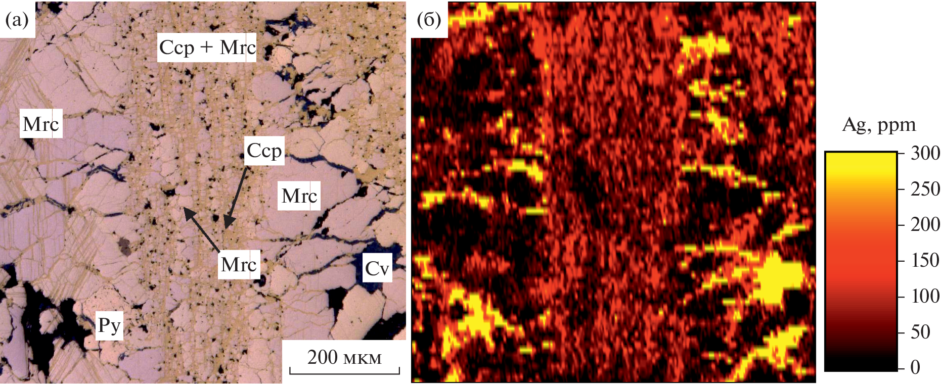 The work presents the first data on sulfide mineralization in carbonate–silicate veins, which are widespread on the islands and coast of the White Sea (North Karelia), associating with Early Proterozoic metamorphosed gabbroid bodies. The veins with Fe–Cu sulfide mineralization up to ore occurrences are localized within metabasite bodies and along their contacts with host gneisses. During the study of the mineral composition of the veins, the main assemblages of sulfide minerals were identified: chalcopyrite –bornite ± chlorite ± selenides and Pb–Ag tellurides (B1); digenite–bornite ± selenides and Pb, Ag, and Pd tellurides (B2); pyrite–bornite ± chalcopyrite (B3); marcasite–pyrite–bornite–chalcopyrite (B4); and siegenite–chalcopyrite ± acanthite ± chlorargyrite. The development of sulfide associations, as well as quartz–chlorite aggregates, was related to the late stage of vein formation. Inductively coupled plasma and laser ablation mass spectrometry analyses showed that bornite from association B1 has the highest silver content (up to 675 ppm) and, in terms of Ag, Se, and Bi contents, is closest to bornite from low-temperature epithermal, skarn, and high-temperature vein deposits. In general, bornite is the main Ag carrier in the studied associations, while digenite containing up to 1000 ppm Ag, as well as discrete silver minerals (selenides, tellurides, acanthite, and chlorargyrite), occur in subordinate quantities. Fluid inclusions in quartz from sulfide associations, as well as from a sulfide-free carbonate–silicate vein, were studied by cryo- and thermometric methods. It is established that mineralization at the late stages of vein formation was related to heterogeneous CO2–H2O–NaCl metamorphic fluid. Carbon dioxide fluid inclusions were captured by vein quartz at temperature of 253–314°C and pressure of 2 ± 1 kbar. Water–salt inclusions were captured in a wider temperature range of 100–500°С. The highest temperature fluid inclusions with temperatures of homogenization >300°С are characteristic of quartz veinlets of the siegenite–chalcopyrite association with Ag sulfide and chlorargyrite.