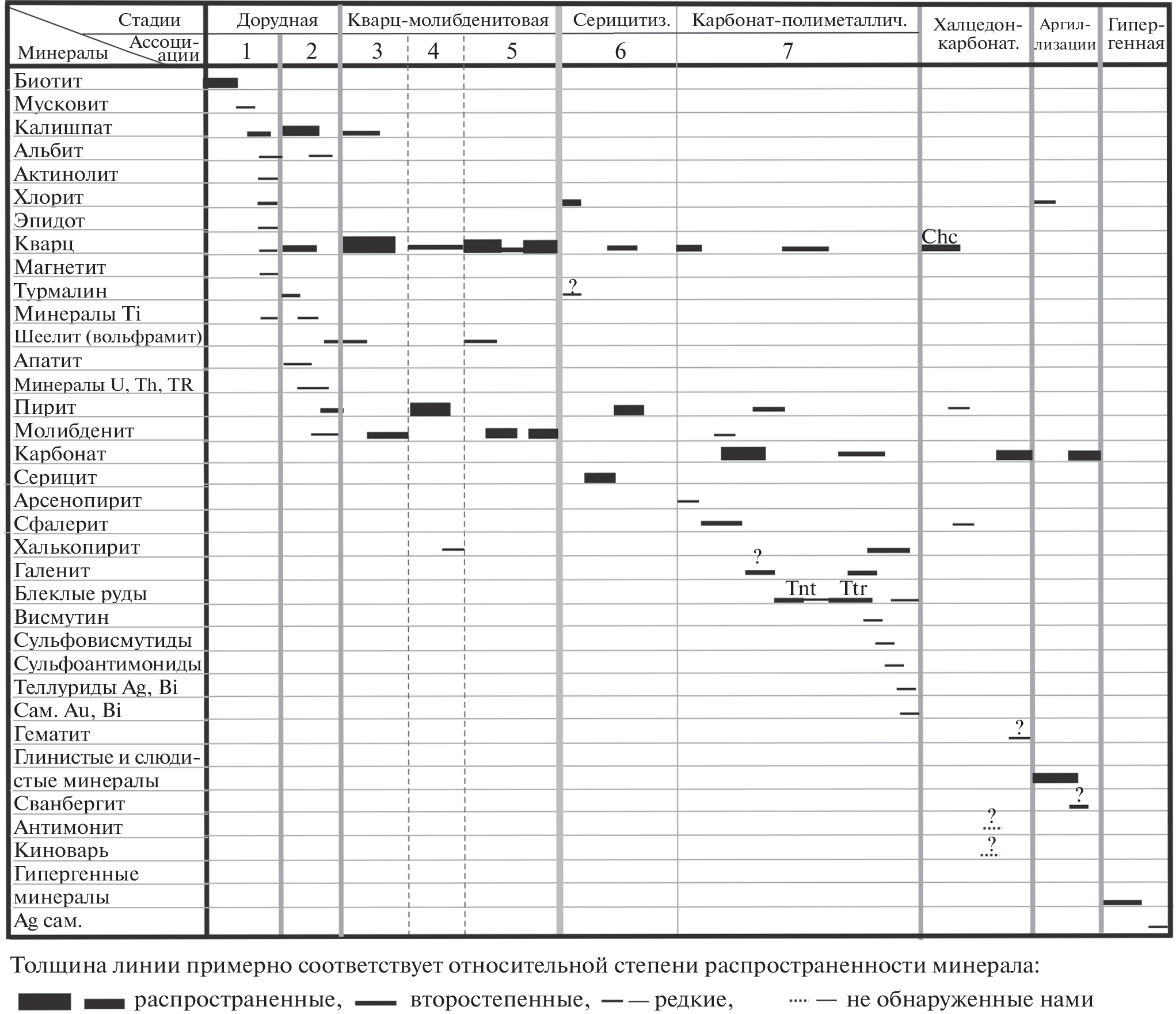 The results of a comprehensive detailed study of the vein structure, mineral zoning of veins, and mineral typomorphism of the Shakhtama deposit obtained on the basis of new samples from poorly studied horizons are given. The results obtained show that the Mo resources of the deposit are far from being exhausted, and the typomorphic features of ore minerals indicate that base metal mineralization associated with Au (Ag), also continues to a depth, along with Mo. The presence of rare Sr mineral, svanbergite, in the Shakhtamа deposit and the typomorphic properties of ore minerals testify in favor of the near-surface origin of the exposed mineralization. The succession of mineral formation has been established. Based on the study of ore and metasomatic zonality, fluid inclusions and isotopic data, as well as the composition of structural impurities in molybdenite, conclusions were made of the formation conditions of ore mineralization in a porphyry ore-forming system.