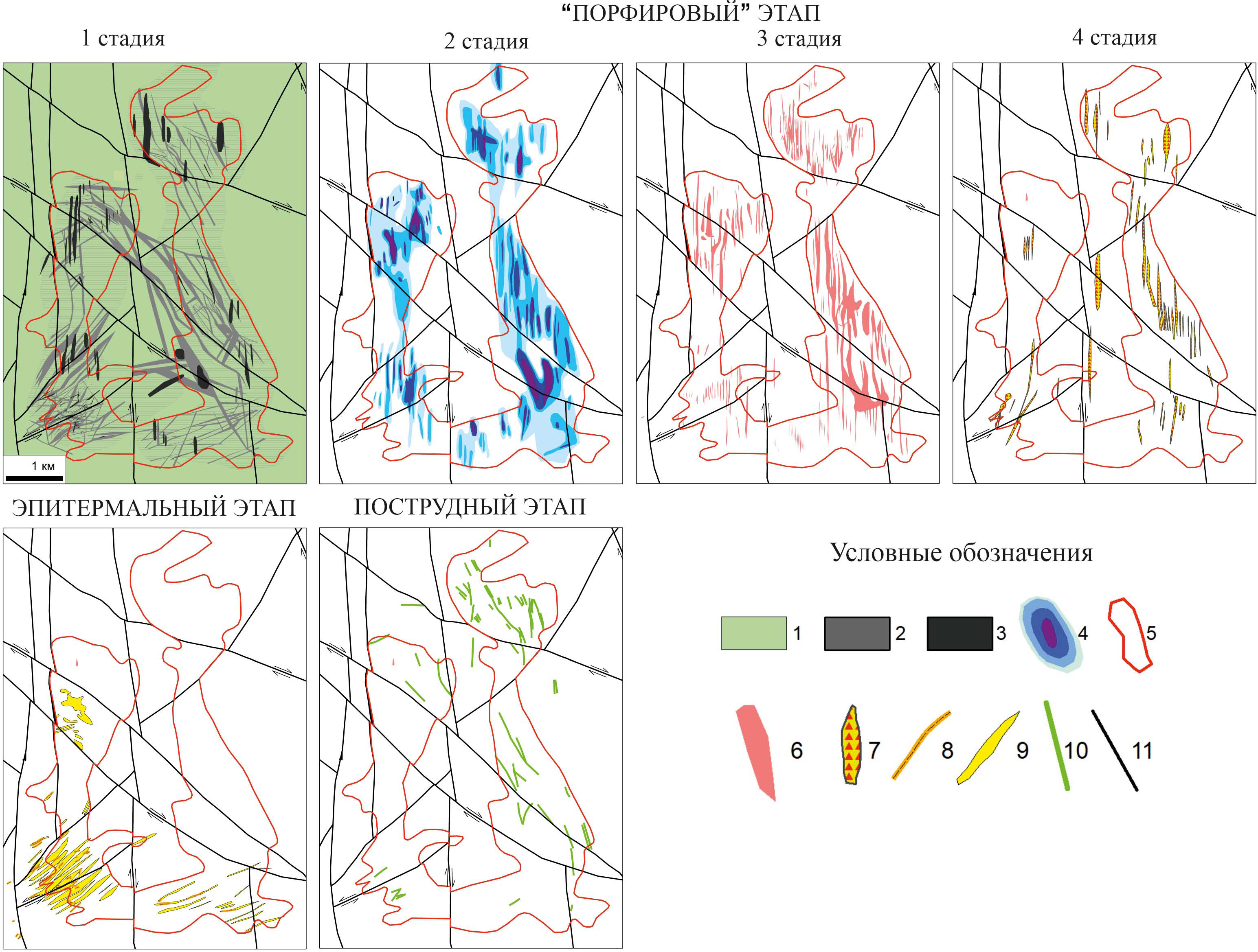 Наиболее поздними являются меридиональные крутопадающие золотоносные (до 5 г/т) сульфидные жилы, которые в осевой зоне штокверка выполняют трещины отрыва. Вероятно, эти жилы возникли на субэпитермальной стадии развития рудной системы. Стадии развития рудного штокверка месторождения Песчанка показаны на фиг. 6.